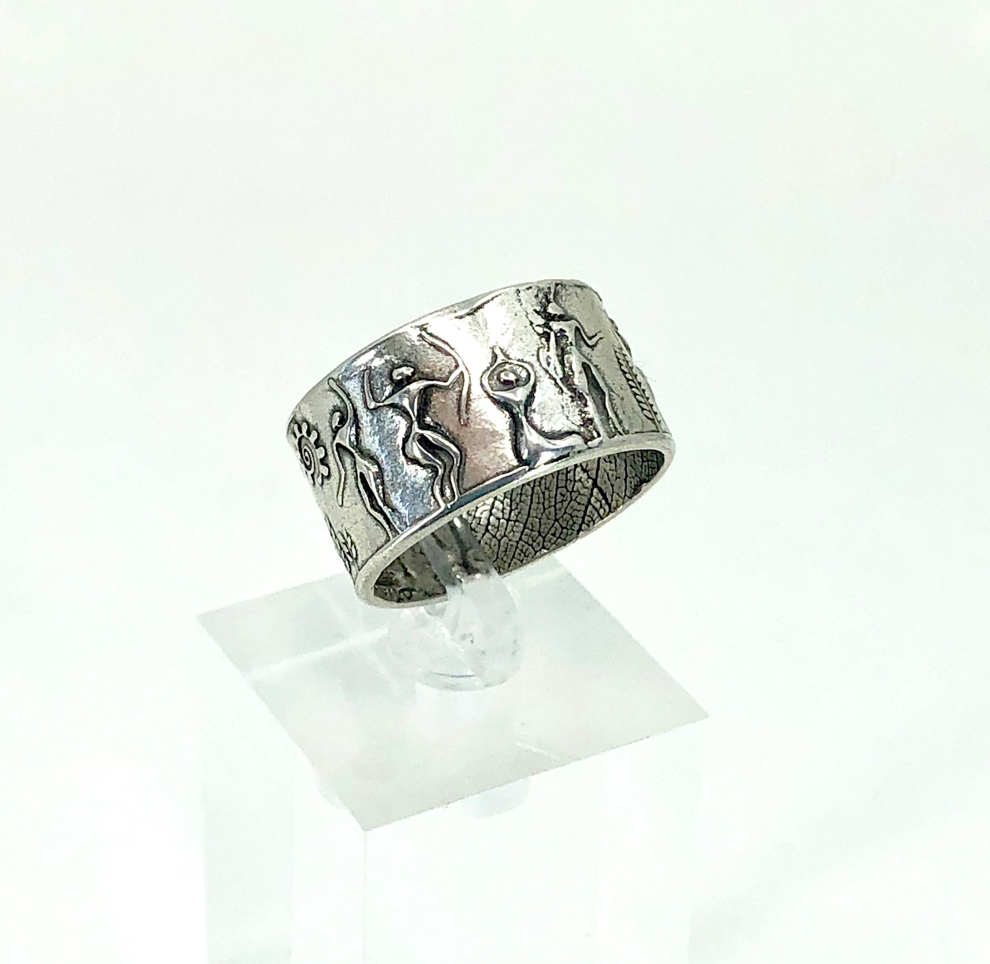This fun sterling silver band has ancient people surrounding the band and made of recycled sterling silver. The inside of the band has a leaf texture, is marked with my makers mark and .925.