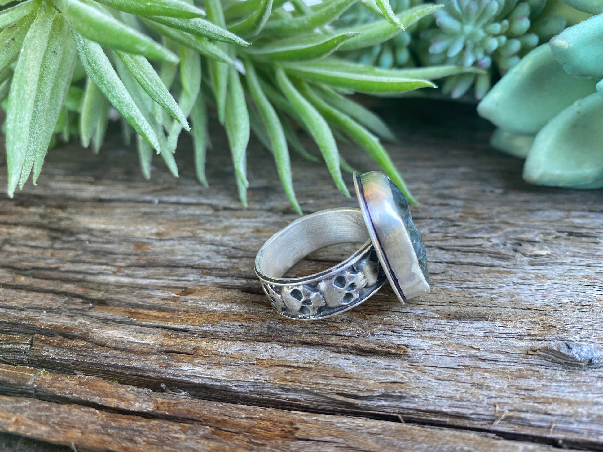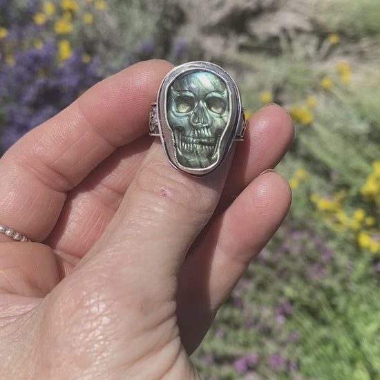 Gorgeous blue/green Labradorite carved skull set sterling silver with a solid sterling cast skull ring shank. Oxidized to make the details pop.