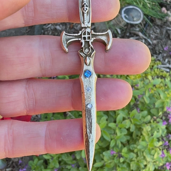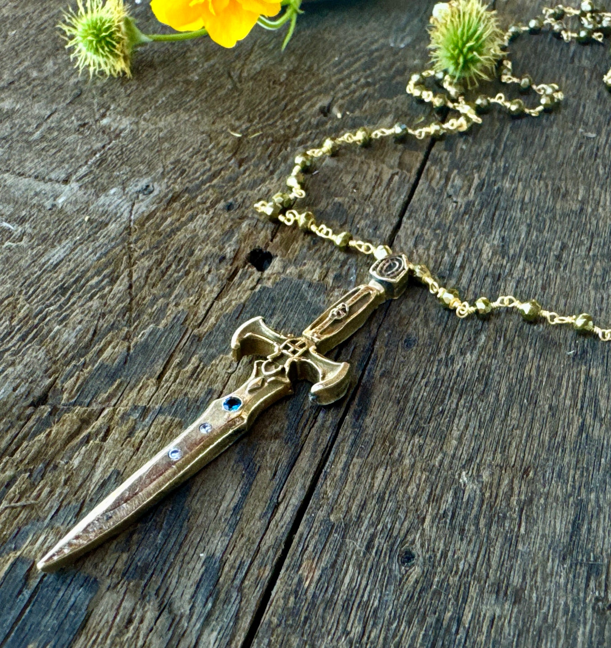 Dagger Necklace - Gold Bronze Dagger With Sapphire And Topaz.