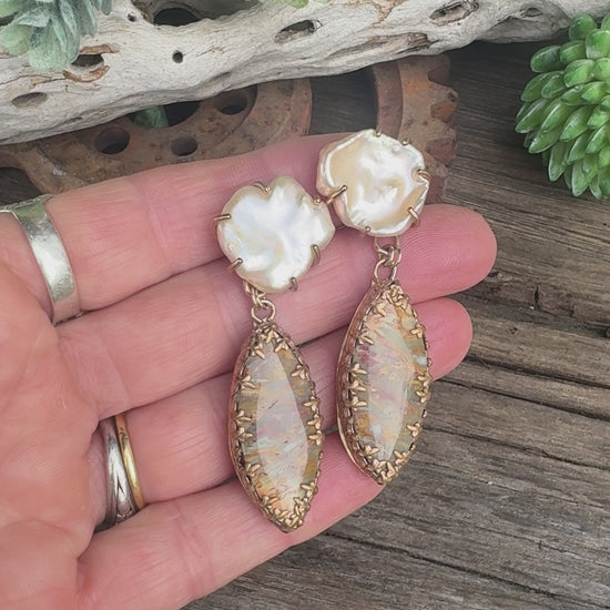 Luxurious gold filled earrings featuring elongated rattlesnake jasper stones paired with lustrous baroque freshwater pearls. The rattlesnake jasper displays stunning natural patterns in earthy tones of rust, cream, sage green, and golden brown, reminiscent of desert landscapes. Each jasper stone is wrapped in ornate gold filled prong settings that complement the organic beauty of the stone. Peach baroque pearls with natural iridescence are set above in delicate gold prongs. These statement earrings blend bohemian elegance with natural beauty. These statement earrings blend bohemian elegance with natural beauty. 14k gold filled post ear wires