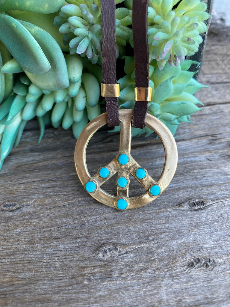 Gold Bronze And Turquoise PEACE Sign Choker Pendant On Brown Leather With 14k Gold Fill