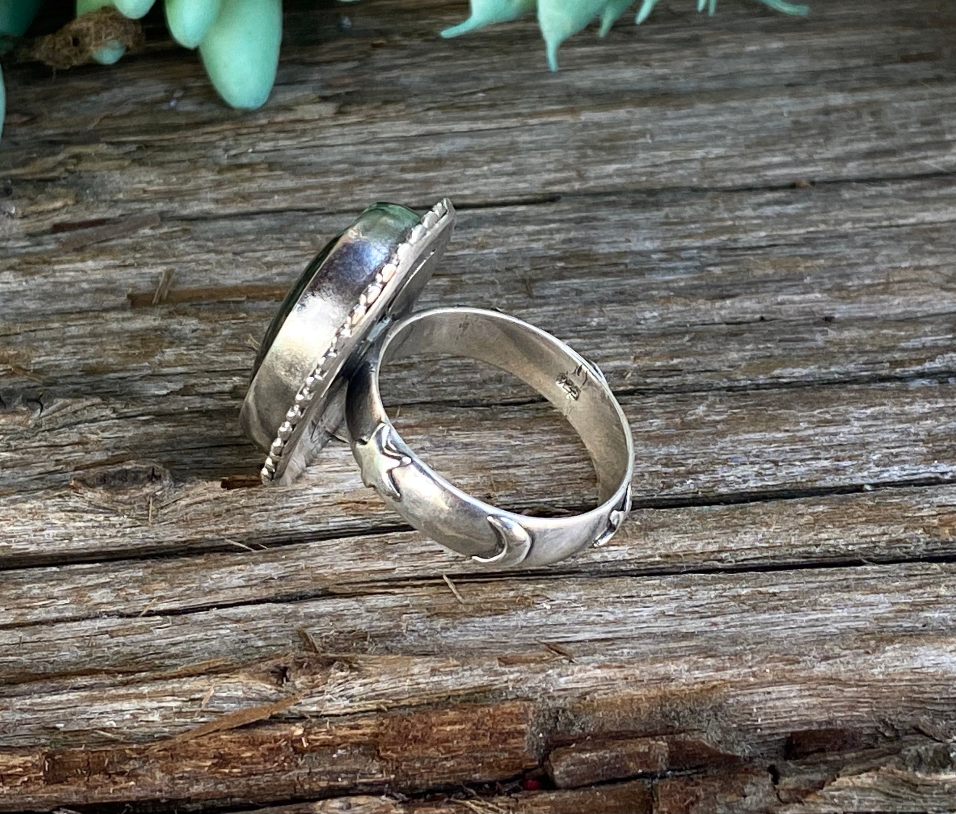 It is set in solid sterling silver with a "pebble" edge detail and a layered, celestial band consisting of 3 stars and 2 cresent moons. Turn it over and even the backplate has a cresent moon cutout for just a little peak of labradorite color shinning through.