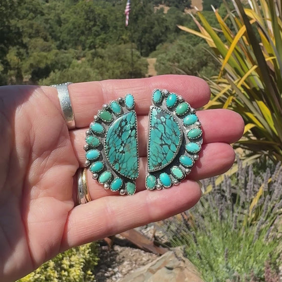 These spectacular Kingman turquoise cluster earrings are a masterpiece of Southwest artistry, featuring dramatically large central stones with the mine’s signature brilliant blue coloration and intricate black matrix webbing that resembles natural lightning patterns. Each earring showcases a substantial half-moon shaped centerpiece surrounded by a stunning halo of smaller turquoise cabochons in varying shades from deep robin’s egg blue to seafoam green. The expert sterling silver work includes traditional serrated bezels and silver ball accents that frame each stone perfectly, creating an impressive display of authentic Native American-inspired craftsmanship that commands attention and respect.