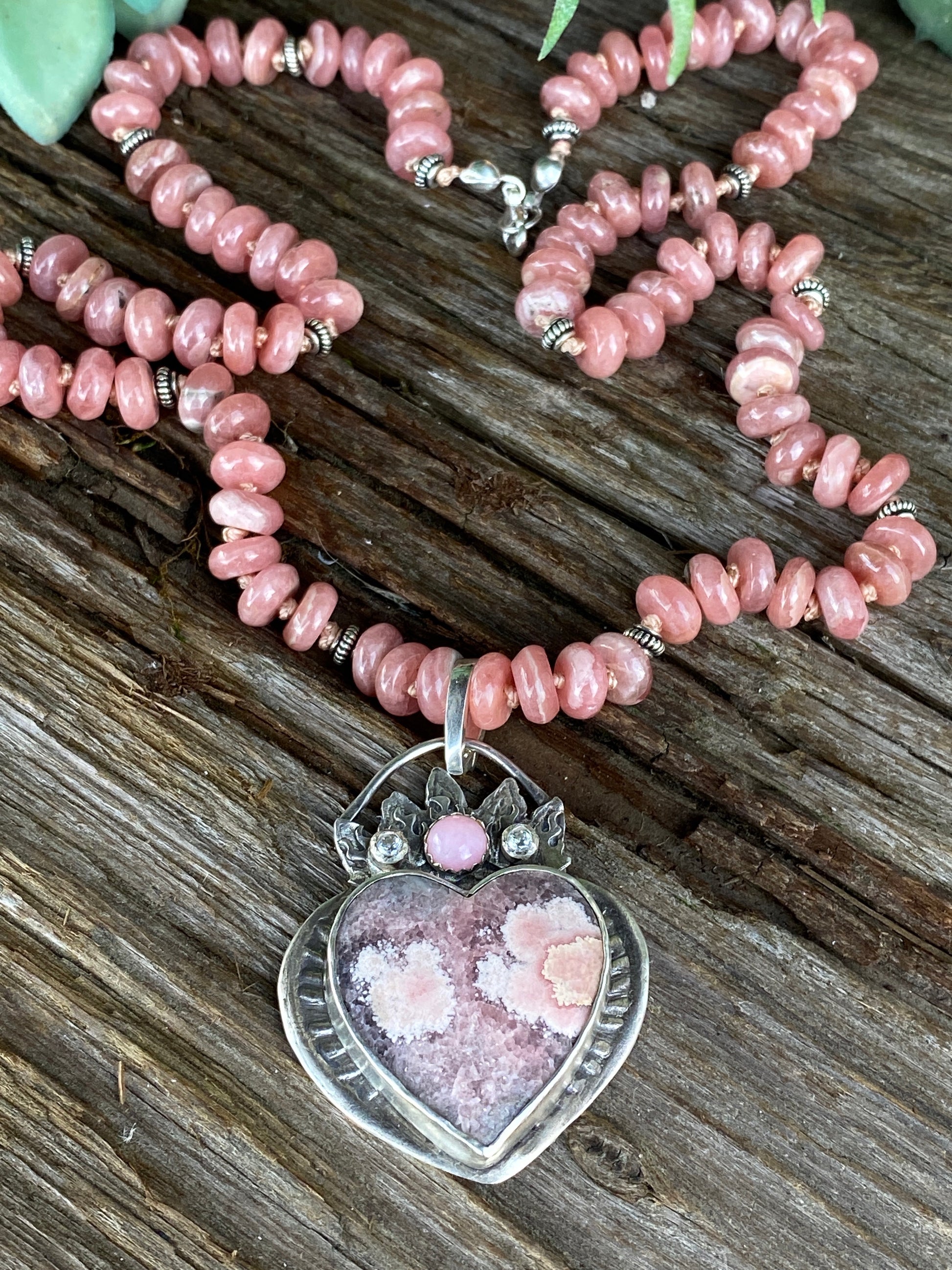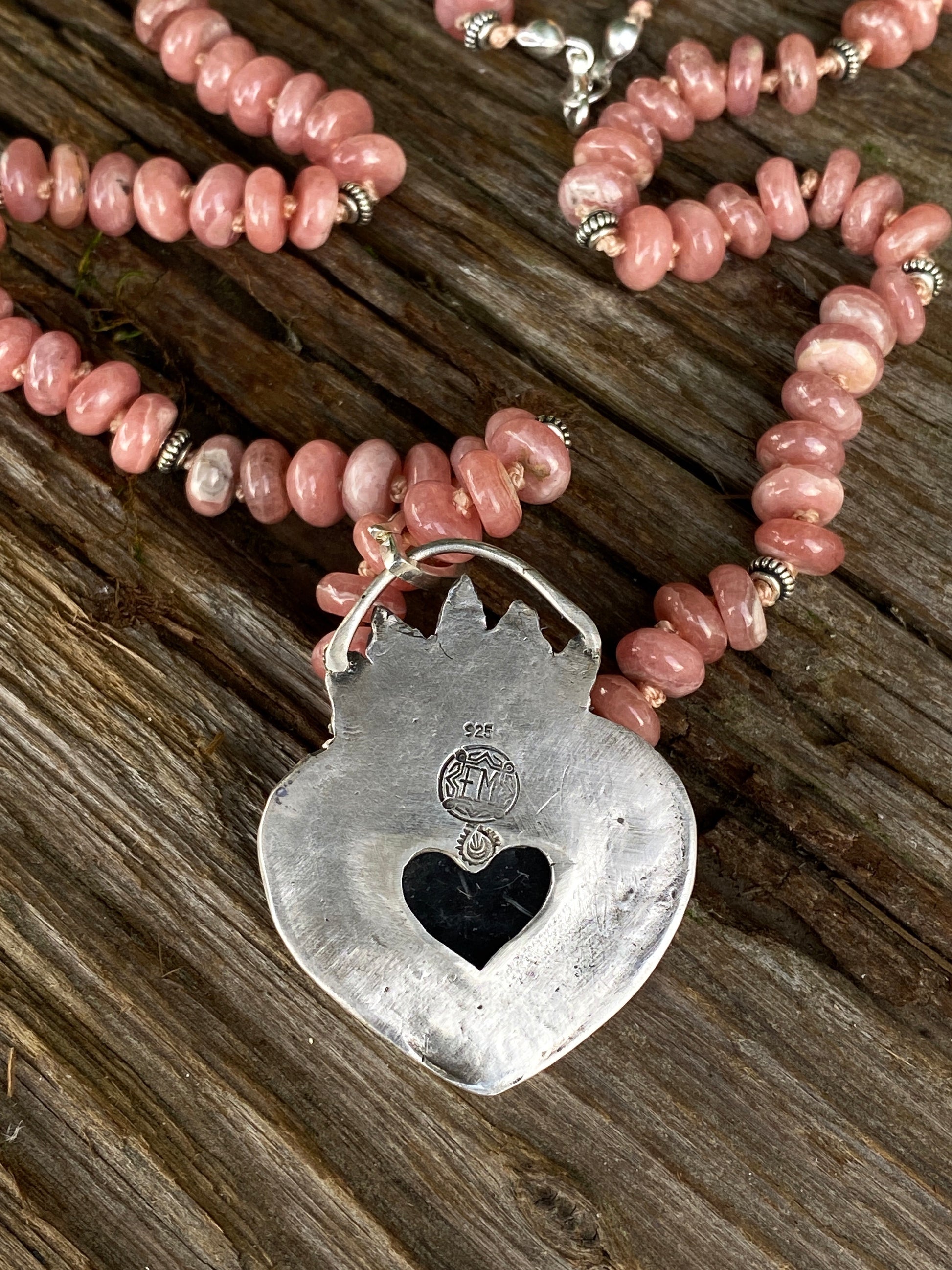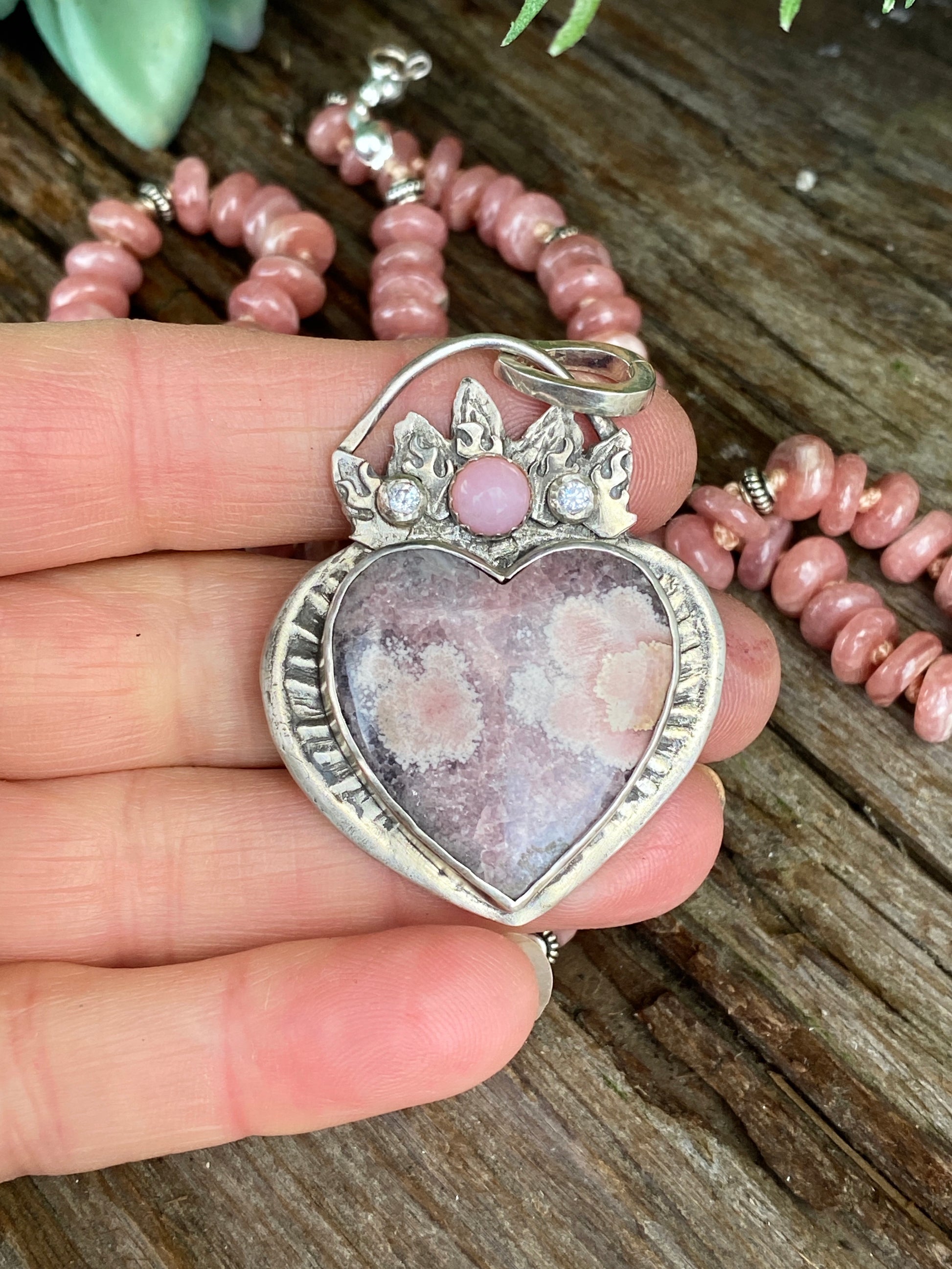 A large Rhodochrosite heart shaped cabochon is the focal piece of this stunning sterling silver statement necklace. The Hearts on Fire backround is made of solid sterling silver with hand added texture to look like the sun is radiating from the side, and a double layer of flames at the top and set with a pink opal center cabochon with two white topaz gemstomes on each side.