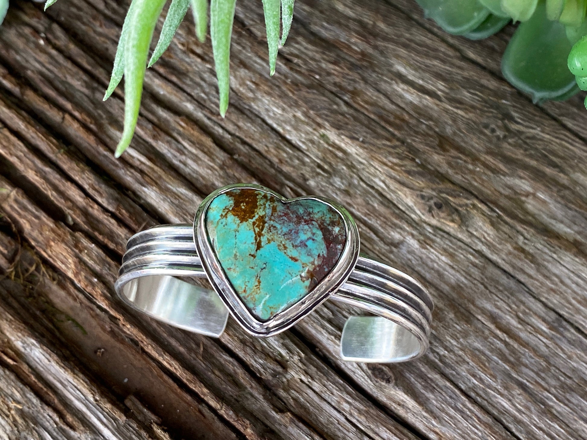 Who wouldn't feel the love to get this gorgeous Royston turquoise heart cuff bracelet? This is a natural Royston turquoise heart with all of it's beautiful matrix speaks for itself so I kept the setting very simple. The quadruple band of silver feels solid but not too heavy and has been patinaed to show off all the detail and then polished to a high shine.