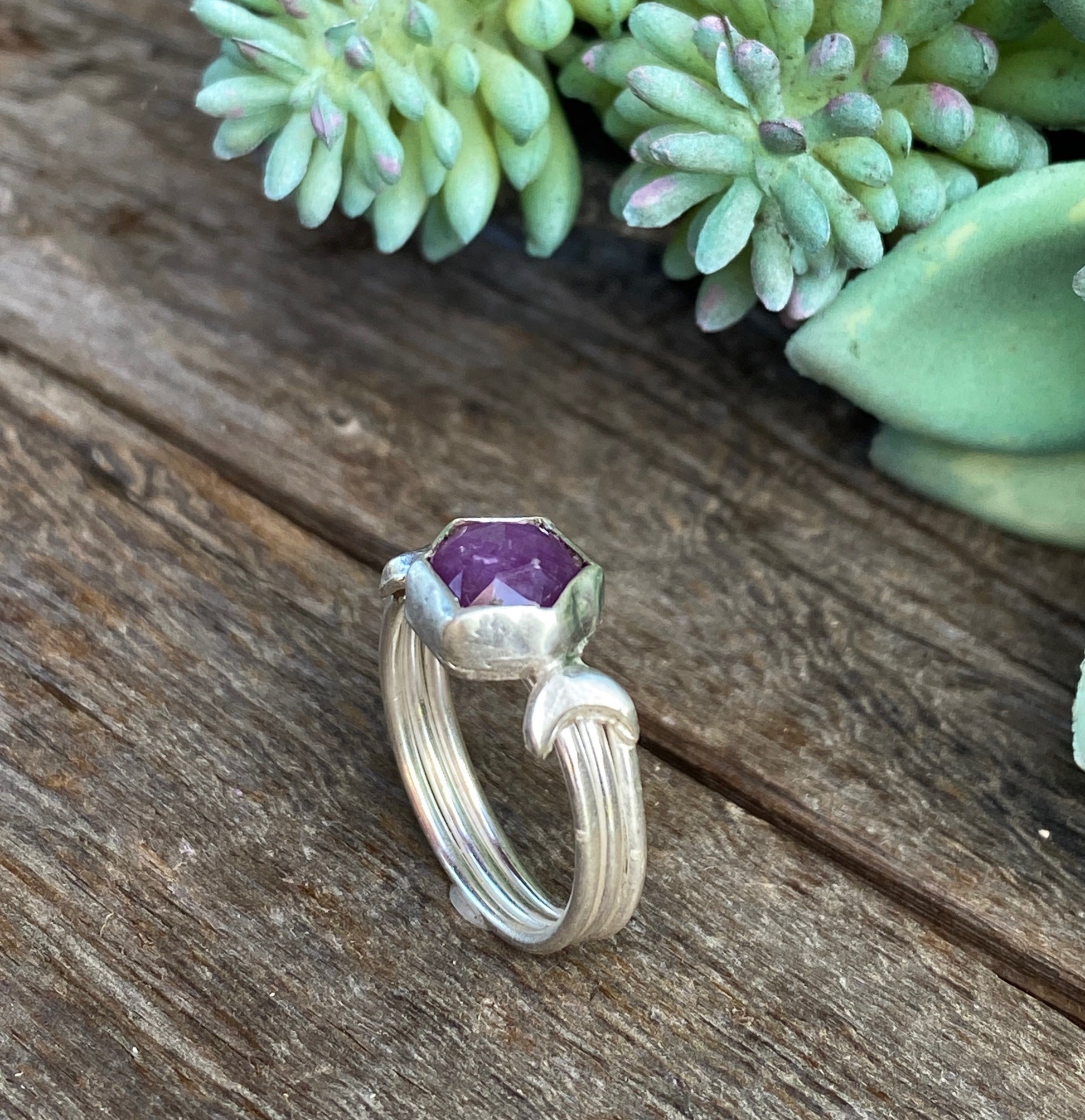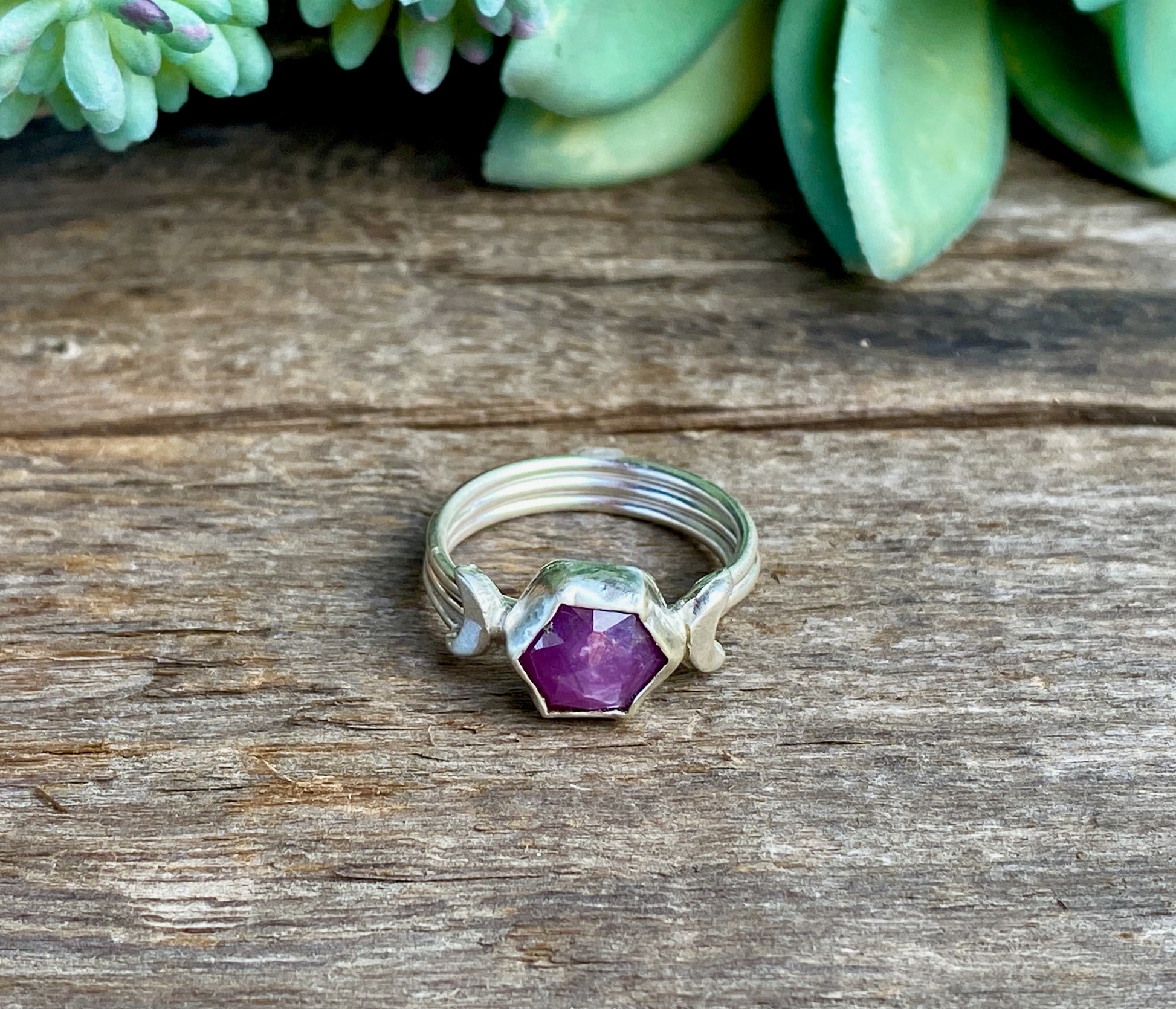 A stunning pink red ruby/pink sapphire gemstone ring. The sapphire is a trapiche with a hexagon shape, clear color zones and a silver sheen, seen from a certain angle. The gemstone measures about 9.5x9.5mm, and is safely held by sterling silver bezel with a cresent moon on each side and set on a triple stering silver band.