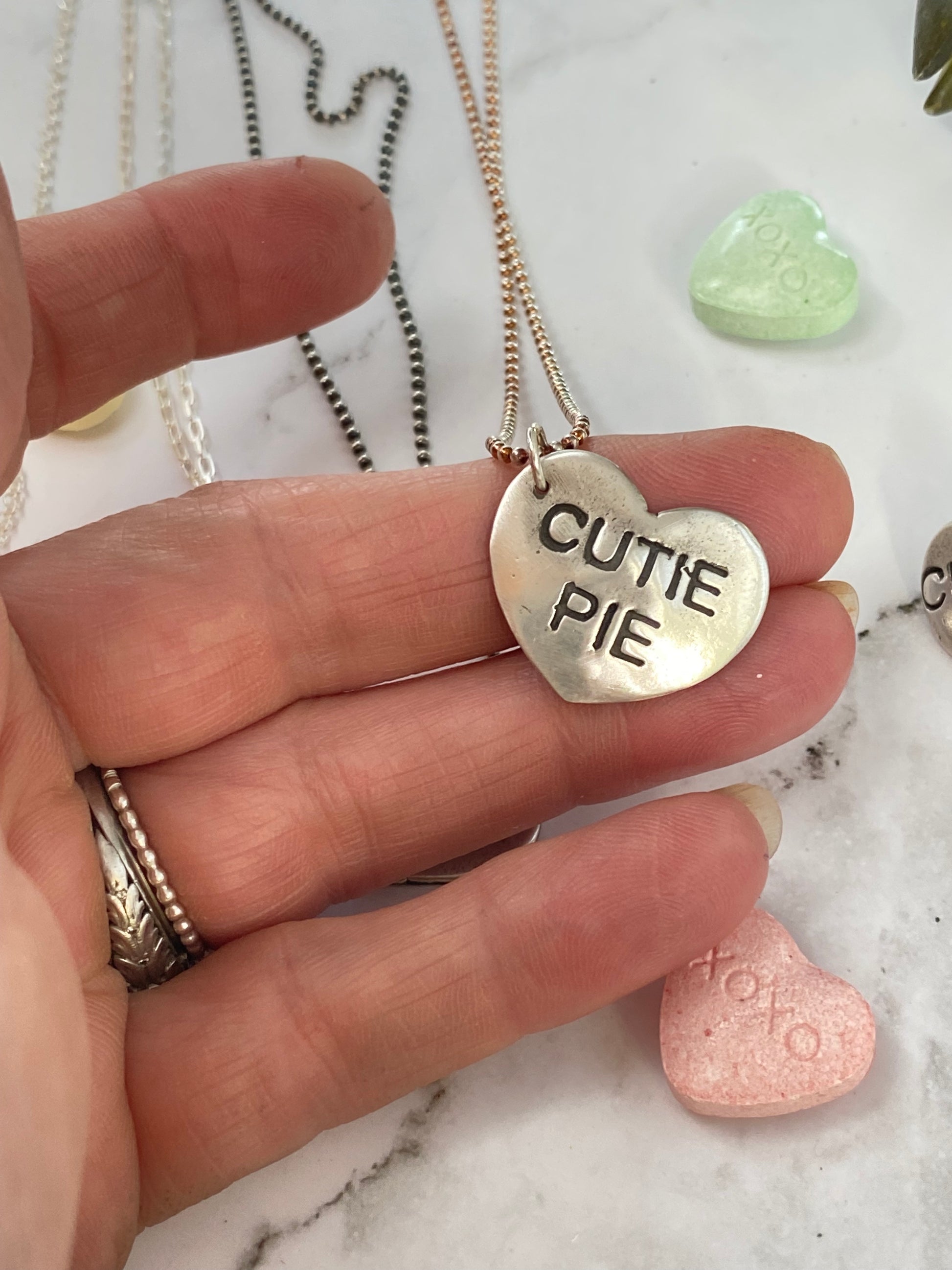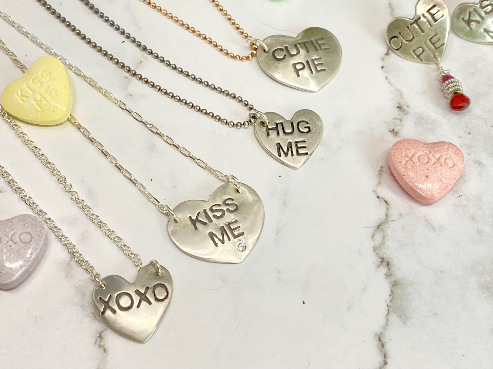 Isn't this the cutest little sweet tart heart you've ever seen? These come in both small and medium sizes, made of sterling silver familiar stamped sayings on the heart charm and strung on a delicate sterling silver chain.