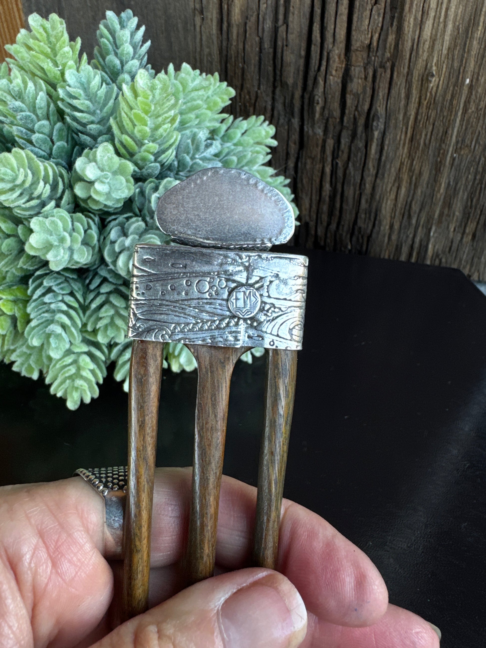 This hair fork was made using a thick wood three prong base, sterling silver setting on top. I would suggest that you refrain from pulling the prongs apart, beyond their natural width to prevent damage. To insert in hair, use the base, not the sea glass portion, of the stick to secure it in place. Note: Twirl your hair into the shape you like, when inserting the stick, you have the best hold if you place the prongs in the opposite direction that you want to go, then reverse your direction to secure. If it gets a little stuck as you are securing, just give it a little "gentle giggle" and it should slide right through.