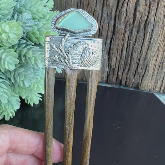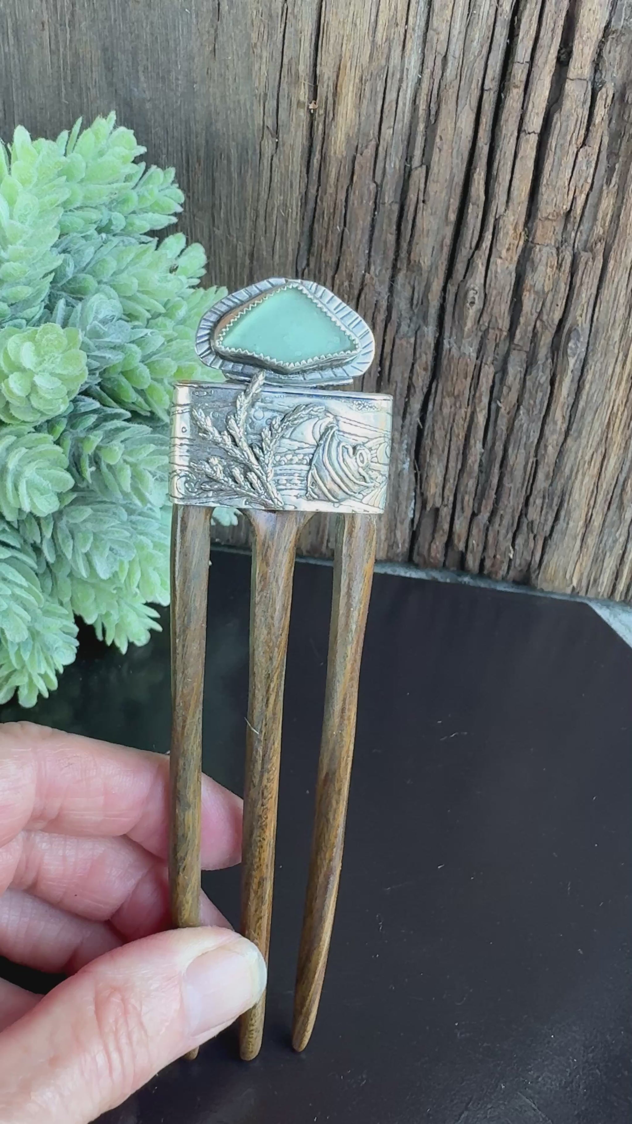 This adorable handcrafted hair stick features a natural shaped aqua colored sea glass set in an ornate sterling silver under the sea texture and adorned with fan coral and a darling little tropical fish. The setting sits on a sturdy triple pronged wood stick making it very strong, light weight and smooth so doesn't damage your hair.