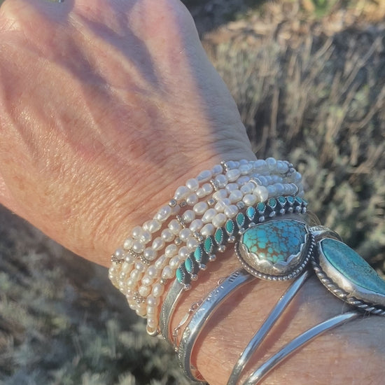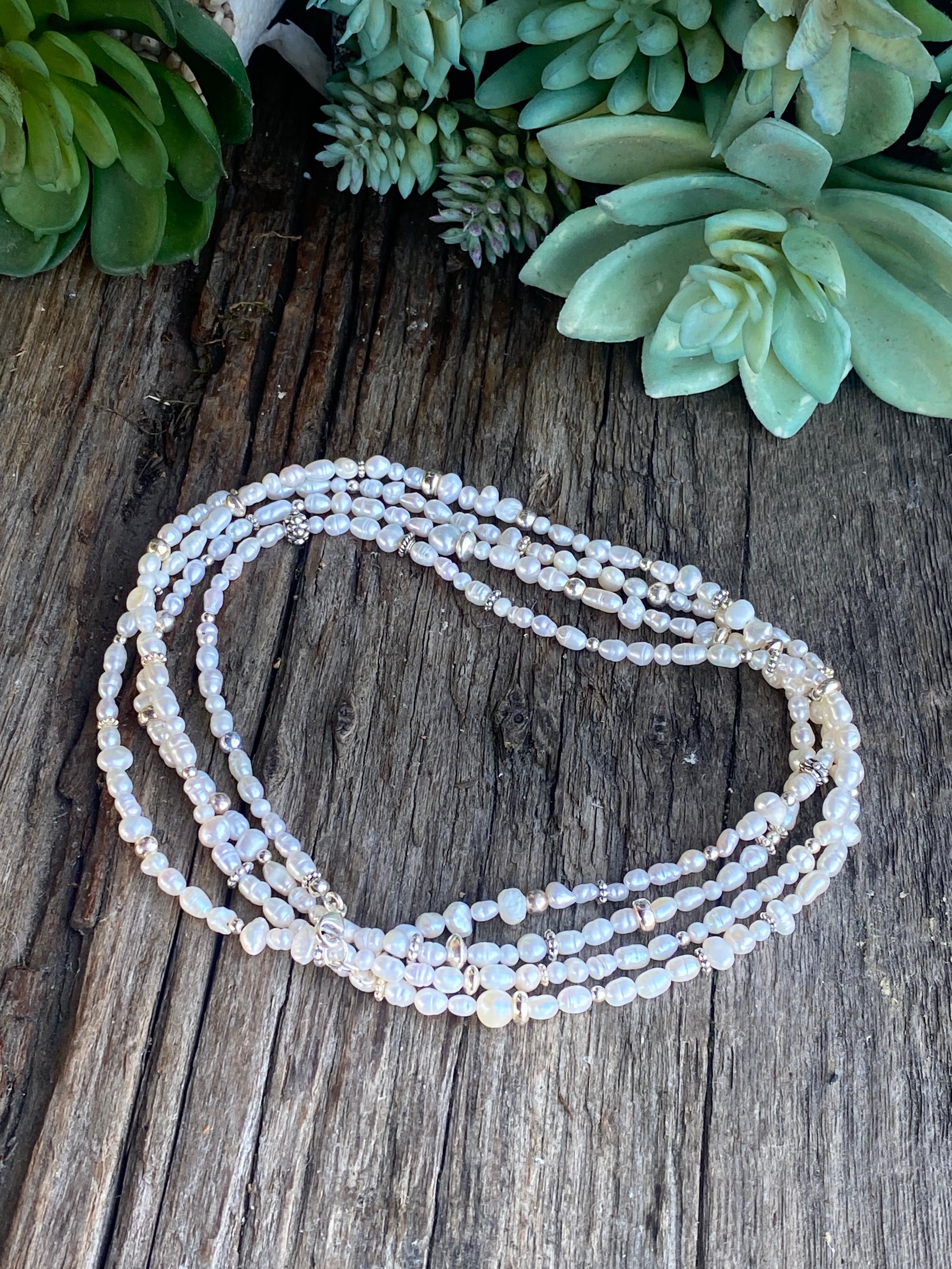 Reinterpreting a classic, these adorable yet elegant strands of freshwater pearls and mixed with sterling silver details are designed to wear as either a multi strand bracelet or necklace or can also be warn as one lomg or a double strand as well. Perfect with your favorite faded jeans and a t-shirt or a sexy little black dress.