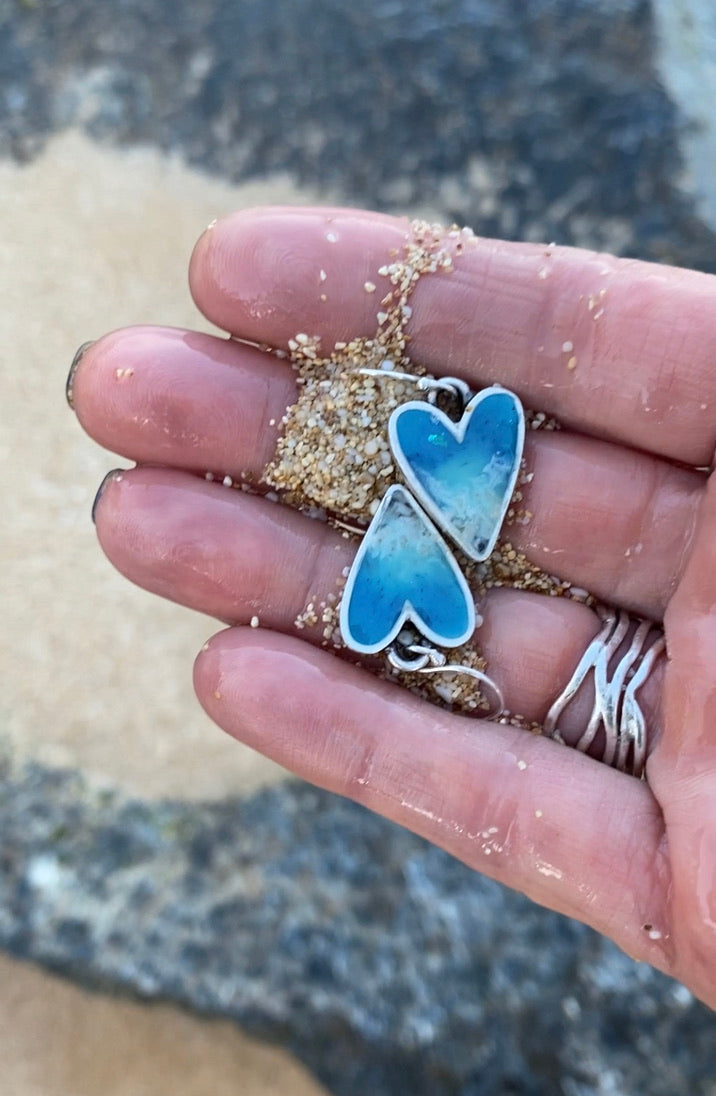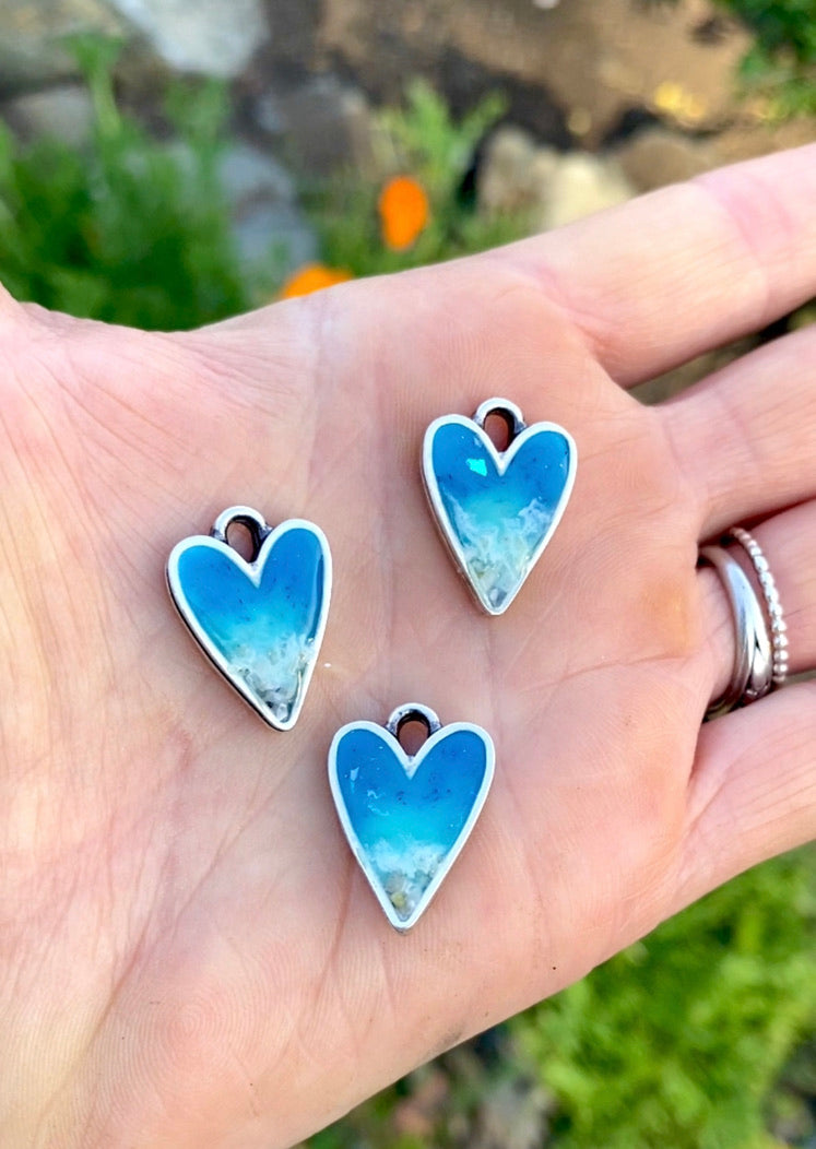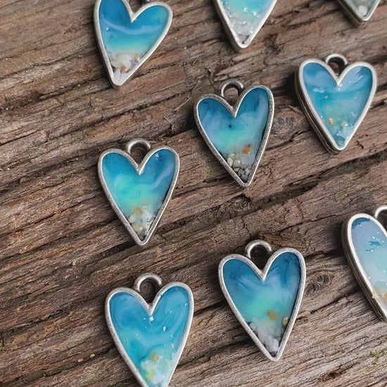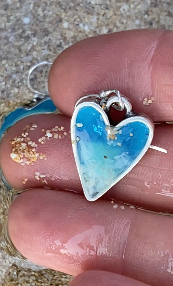 A darling heart made from resin and Sunset Beach Hawaii sand. Wear a reminder of the spirit of the ocean, your favorite beach vacation, or just to warm your heart. The color shifts from Ocean blue to Caribbean green with hints of other colors replicating the waves laping on the sand. You can almost hear the sounds. Depending on your lighting these will be subtle to bright color changes.