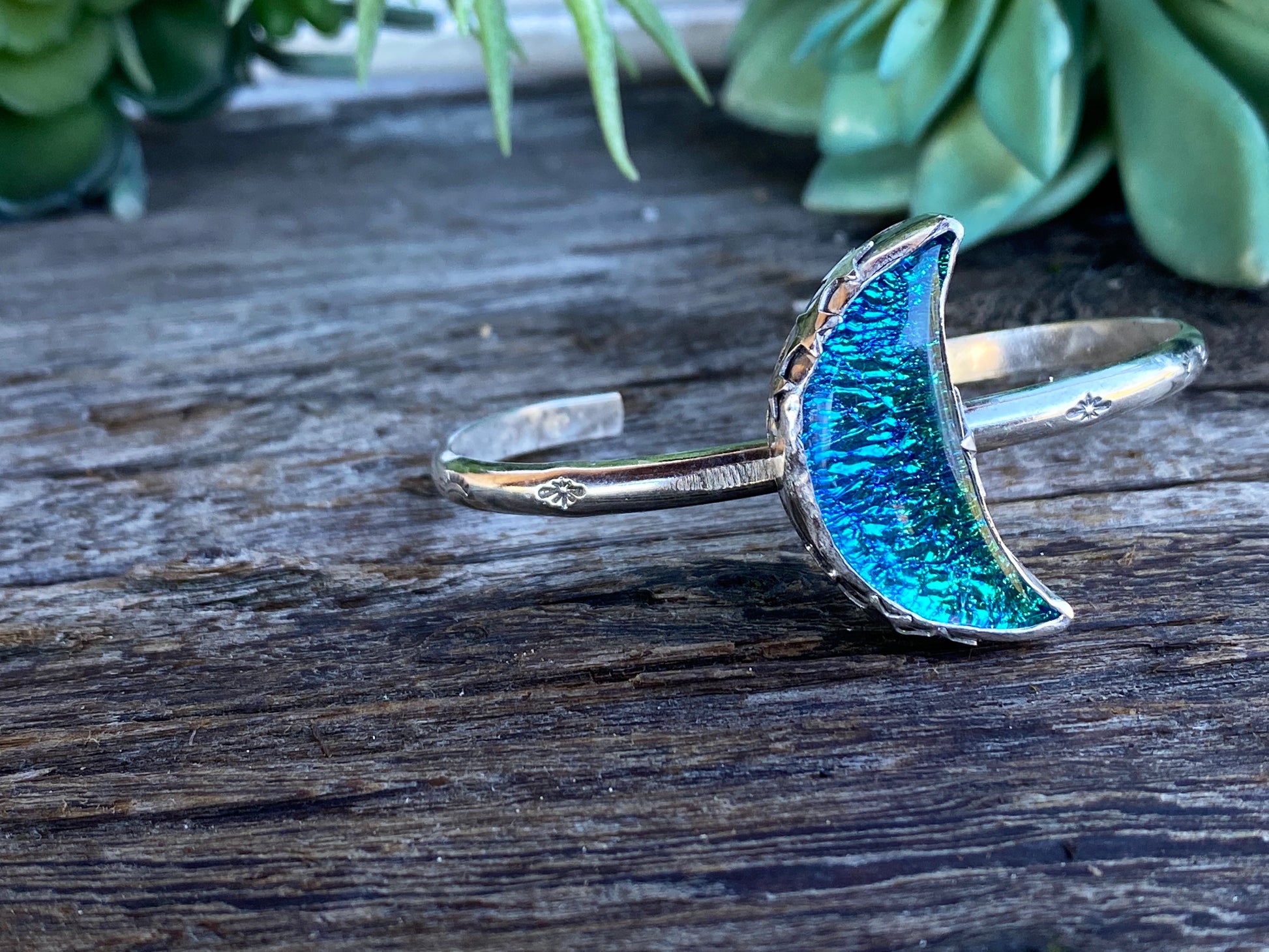 I love everything about this cuff! The 1/4" wide of recycled Sterling Silver and hand stamped on the band. The moon shaped opalite (man made Opal) is surrounded by sterling silver and stars that do a littl creep up and over the edge. I lightly oxidized to enhance the details.