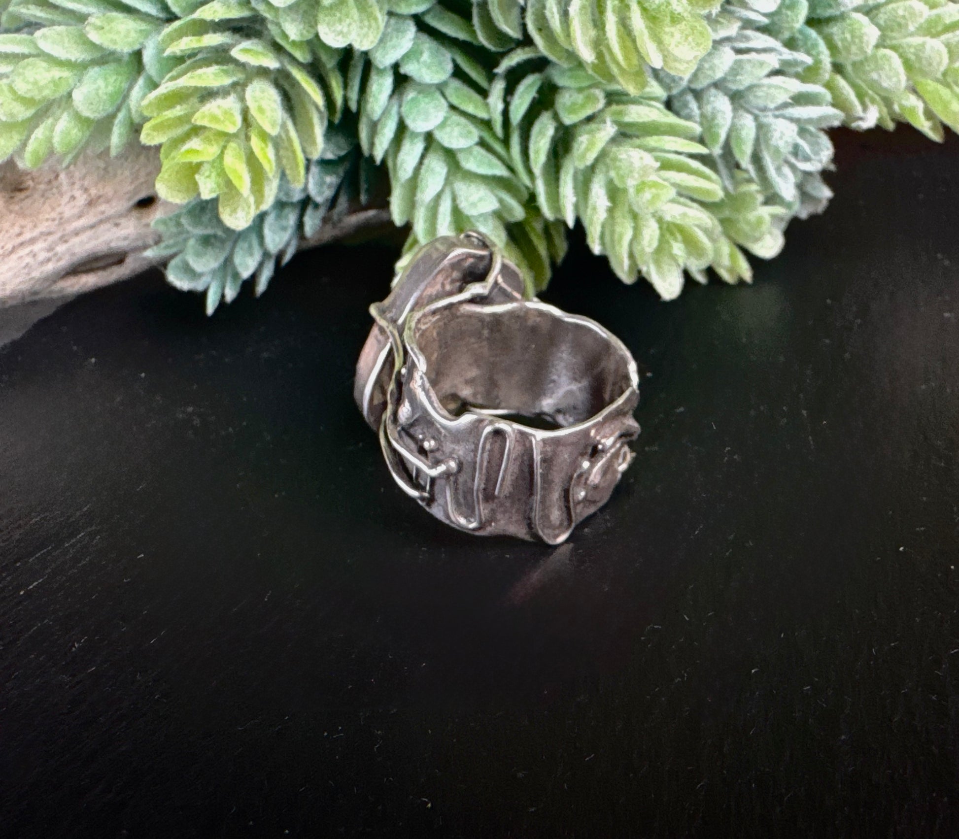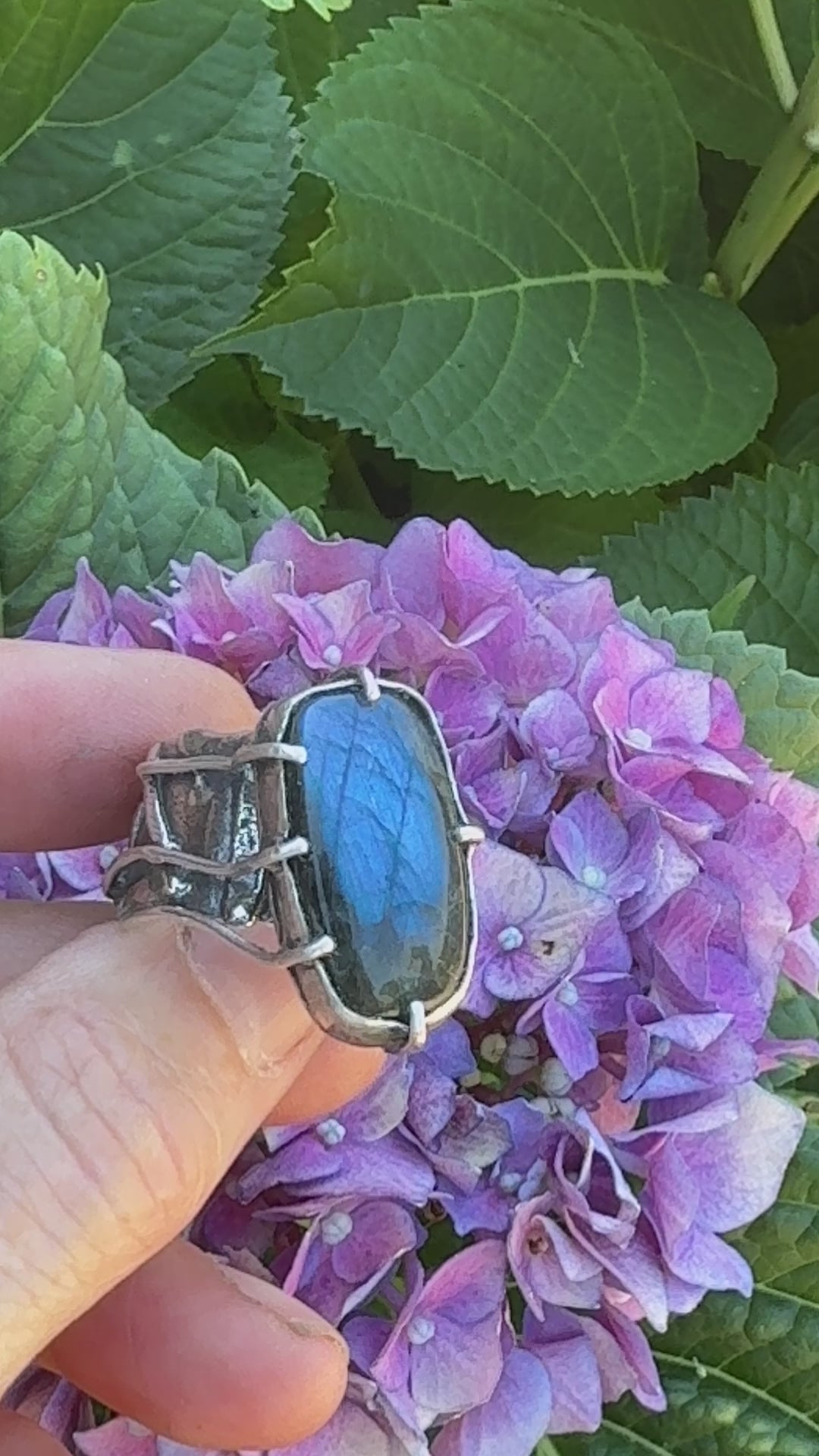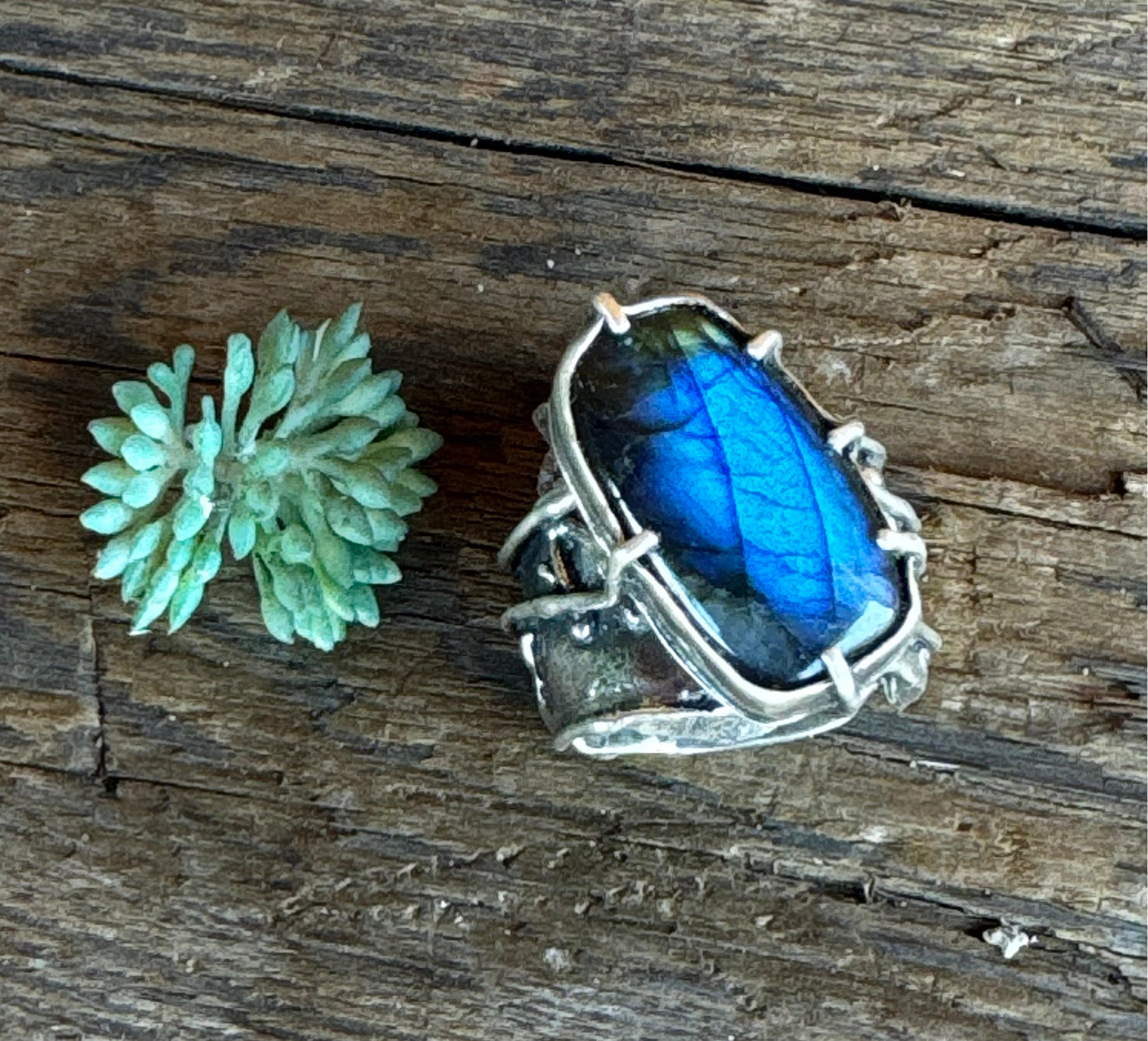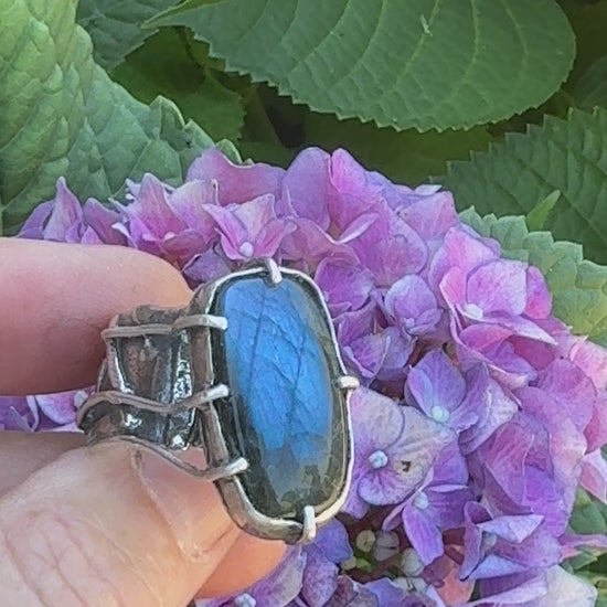 Fun, funky and gorgeous- it is the best way to describe this organic style Labradorite ring. Big blue flash labradorite in a rectangular shape off set and floating above the band. The band is full of texture with a melted edge.