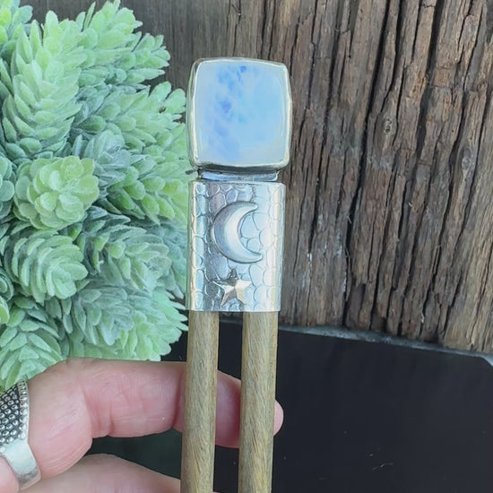This adorable handcrafted hair stick features a gorgeous Rainbow Moonstone cabochon set in an ornate sterling silver setting with lots of texture and added moon and star designs, including a moon cutout on the back. The setting sits on a sturdy double pronged wood stick making it very strong, light weight and smooth so doesn't damage your hair.