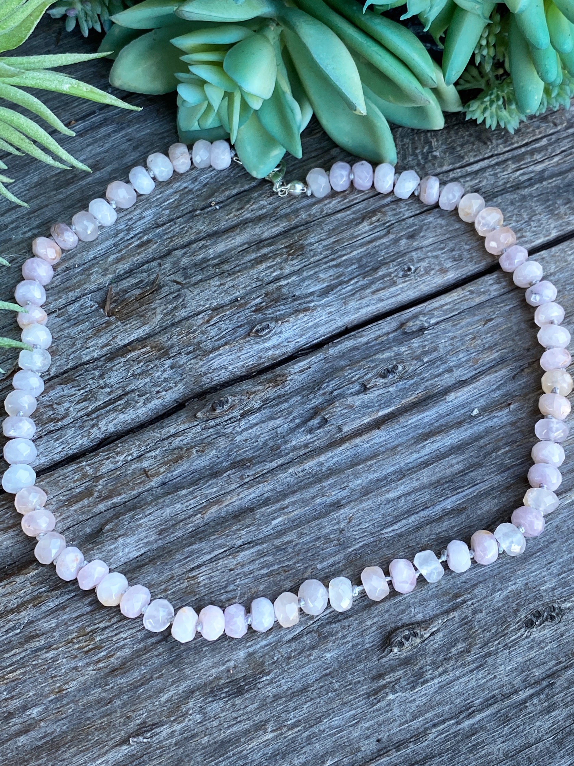 A gorgeous hand knotted faceted rose quartz gemstone candy necklace made with 8 mm sized beads. All stones are natural genuine gemstones—never glass. Strung on 100% pure silk silver thread for durability with sterling silver clasp.
