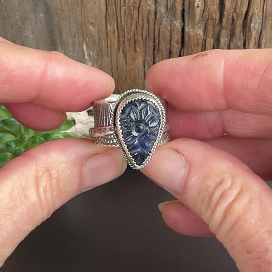 Carved Sapphire magic spinner. This stunning blue sapphire features an intricate hand-carved floral design that's absolutely mesmerizing! Set in textured sterling silver with gorgeous artisan detailing - it's like wearing a piece of art on your finger. This ring speaks to both vintage elegance and timeless sophistication. There is a hammered band that spins when activated, for those who need something to fidget with, or it's just pretty added detail.