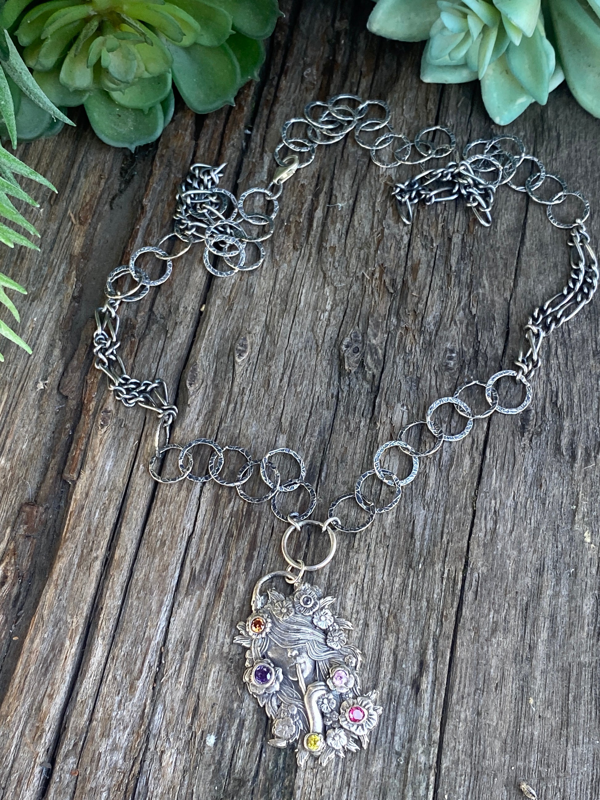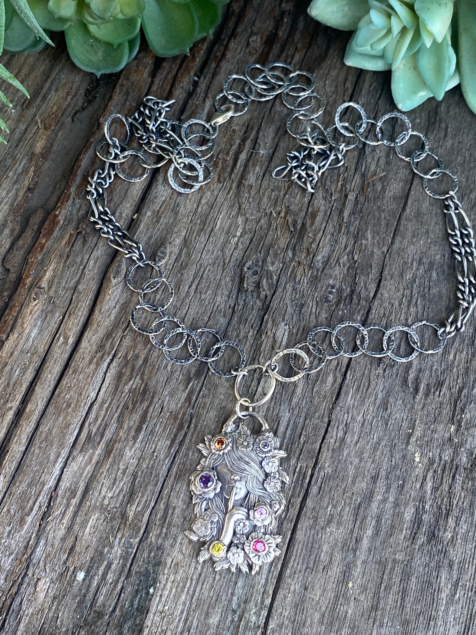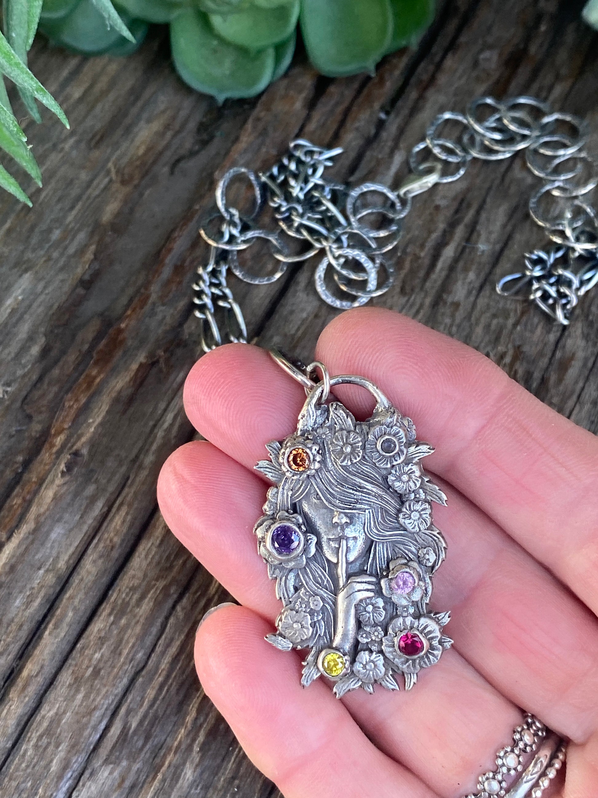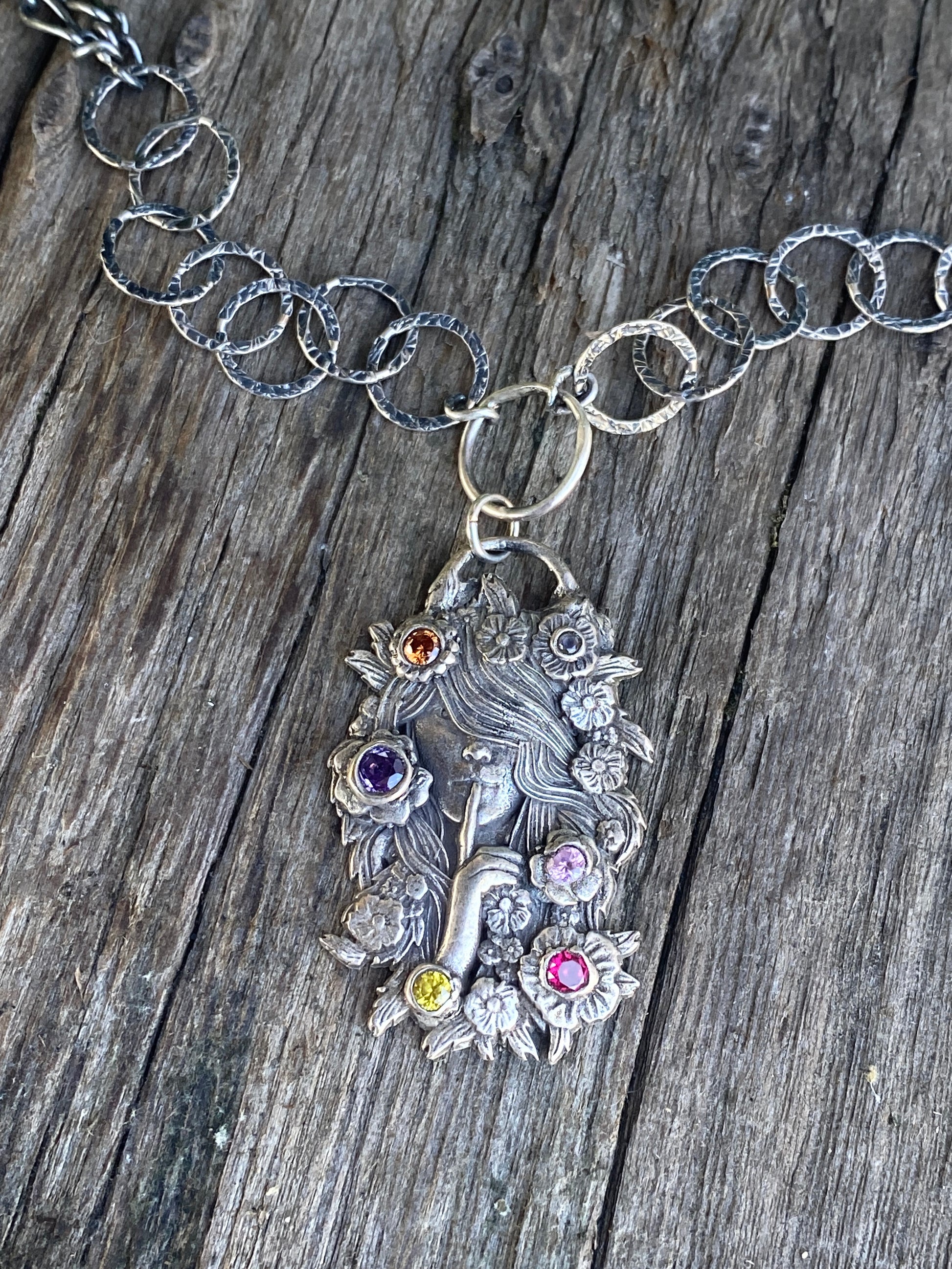 A truly unique, handcrafted “secrete garden” pendant necklace made from recycled Sterling Silver. Layers and layers of hand cut flowers and leaves tucked into her flowing hair with just enough gemstones sparkling from the flower’s center to giver her life.