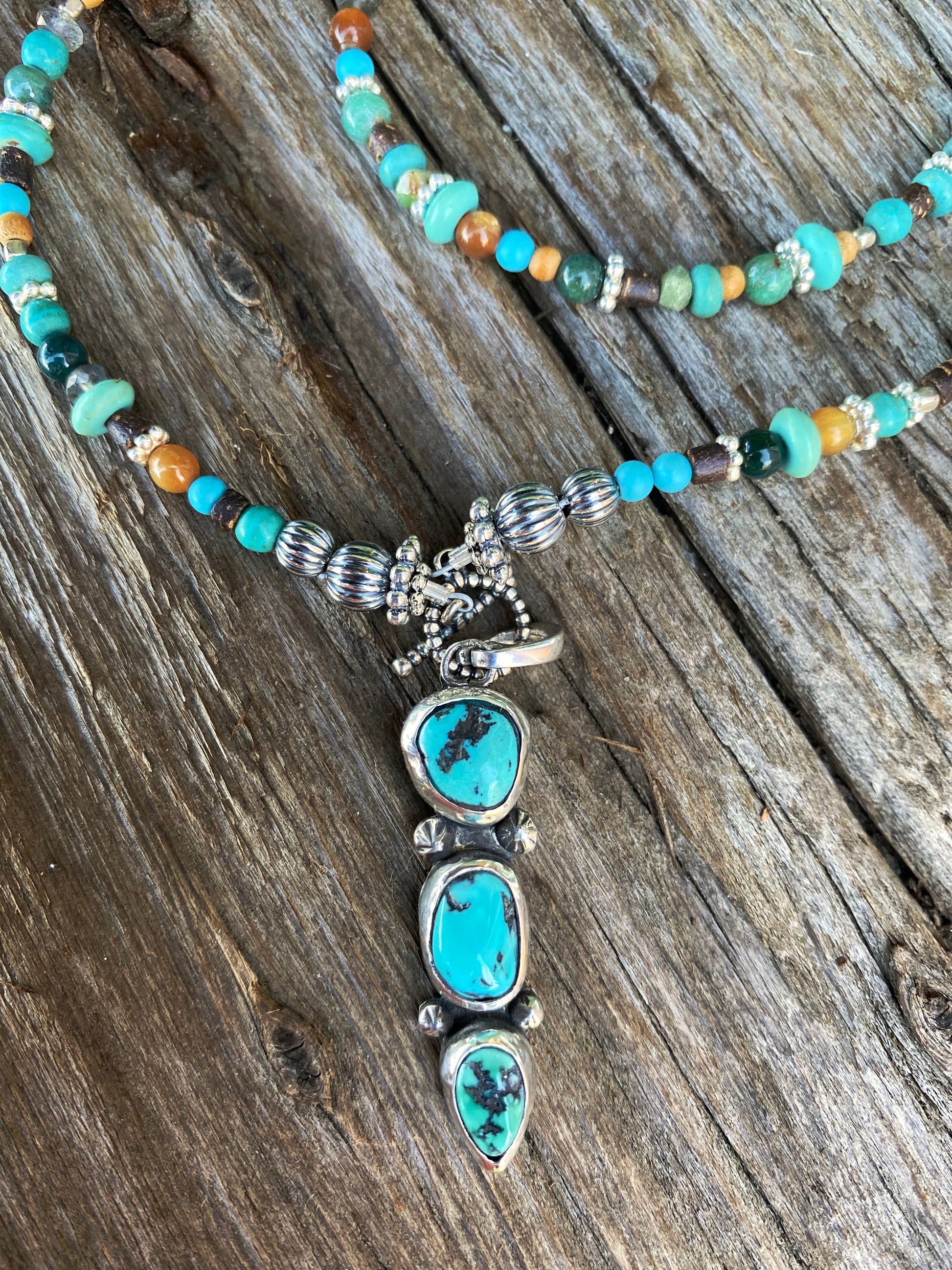 Totem Spirit Necklace - Turquoise And Sterling Beaded Chain With Triple Hubei Turquoise Pendant