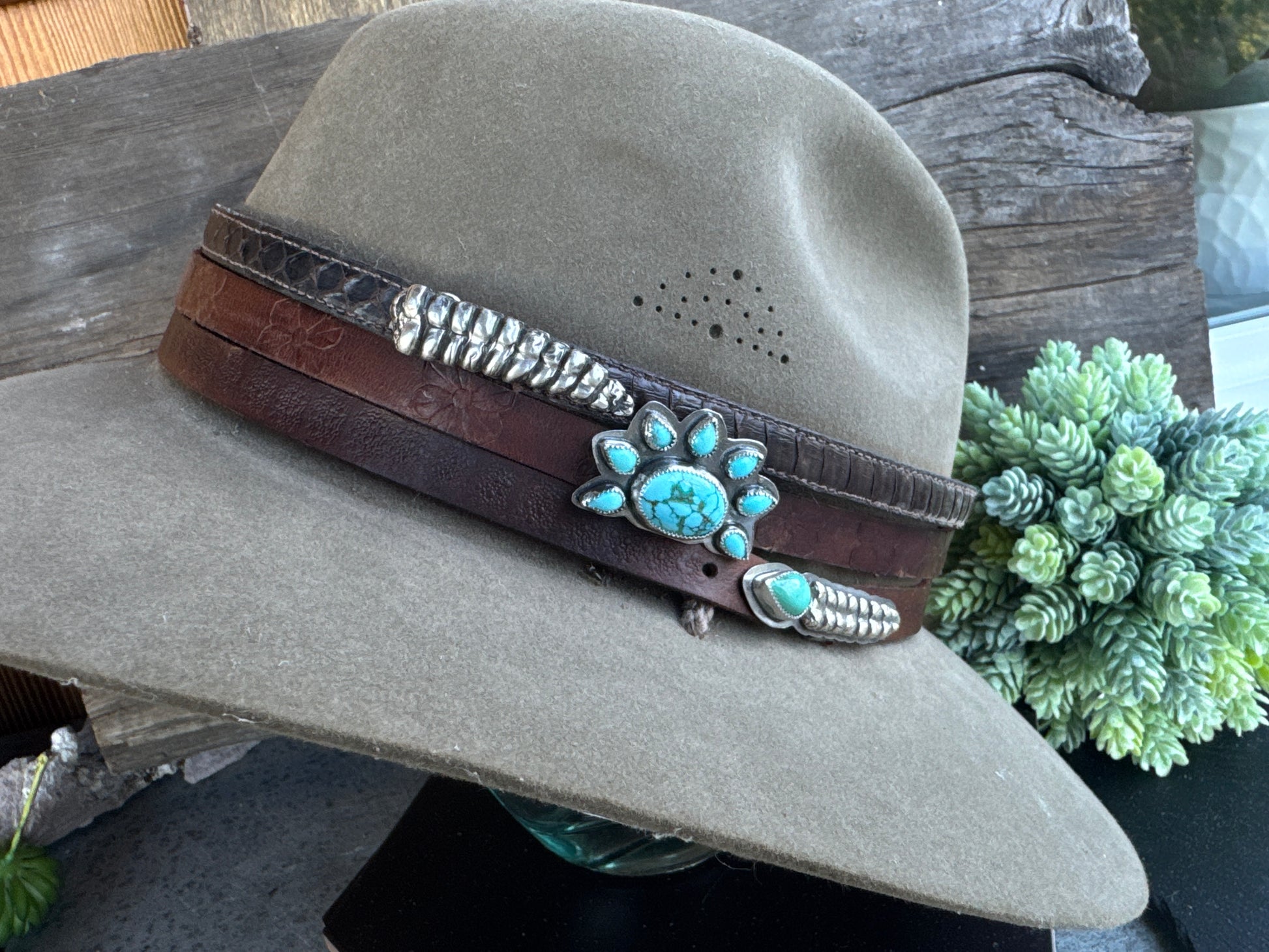 Transform your favorite hat with this genuine turquoise and rich leather hat band. —Each one is handcrafted from start to finish, from the silver and turquoise to the hand stamped & lined leather band.