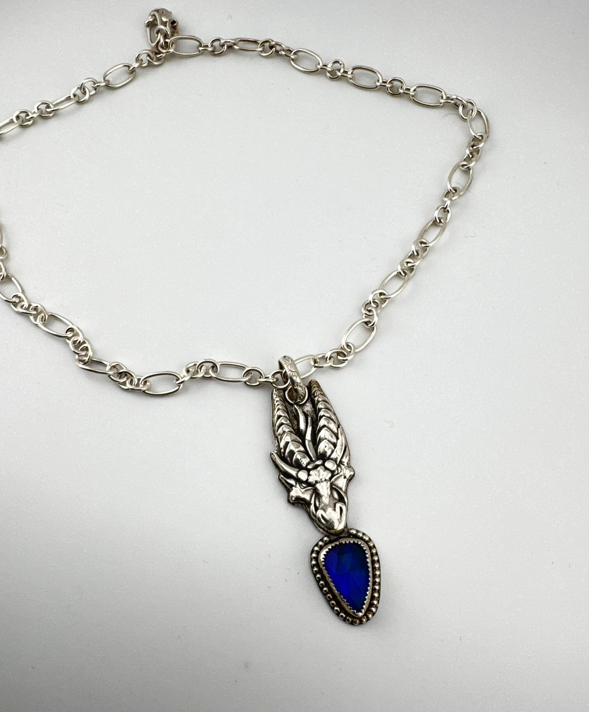 Hand fabricated solid sterling silver gargoil talisman necklace with a gorgeous deep blue opalite quartz gemstone that changes with movement to blue, green and pink/purple flashes. Let him shield you from any negative energy while keeping you looking fabulous 💙.