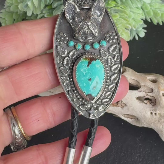 The Laney Wilson Kingman Turquoise French Bulldog Bolo Tie - Handcrafted Sterling Silver & Kingman Turquoise Bolo Tie