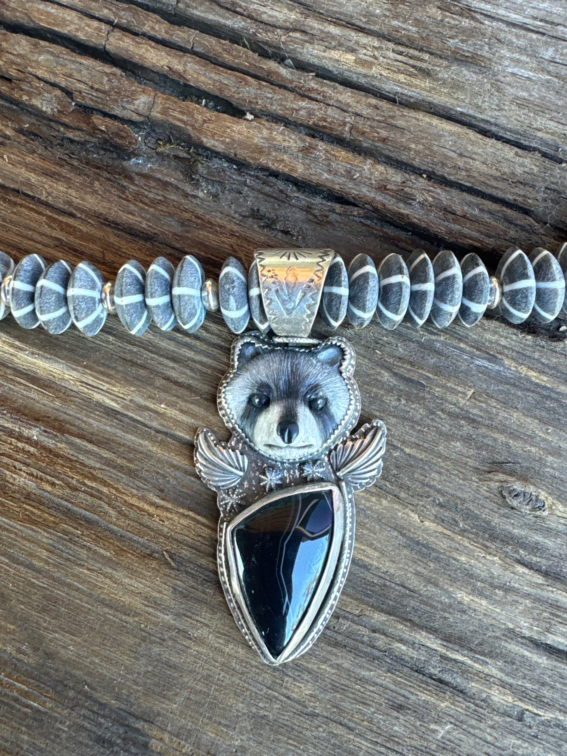 The Night Prowler Necklace- Sterling Silver, Agate, Water Buffalo Bone & Mr. Racoon