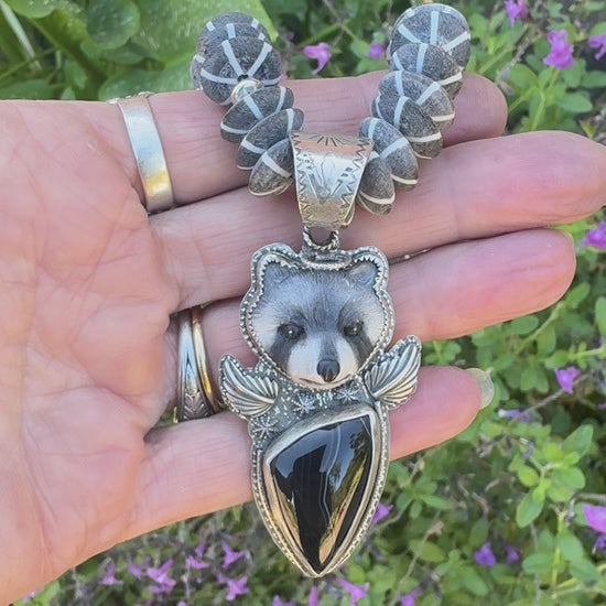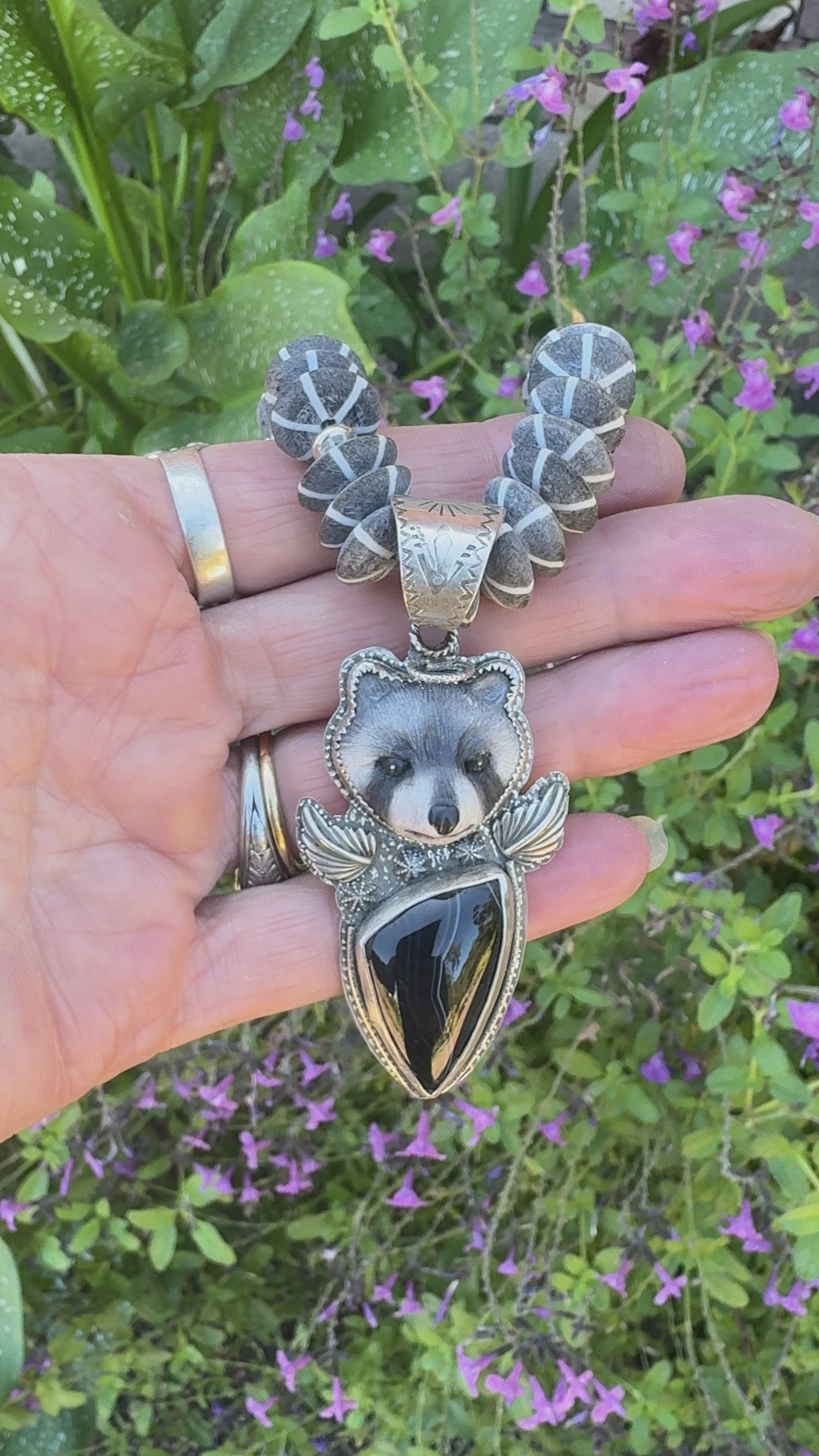 Stunning sterling silver & buffalo bone necklace with an absolutely adorable raccoon pendant! The detail work is absolutely mesmerizing - from those lifelike eyes to the gorgeous dark agate stone drop. This piece tells a story!
