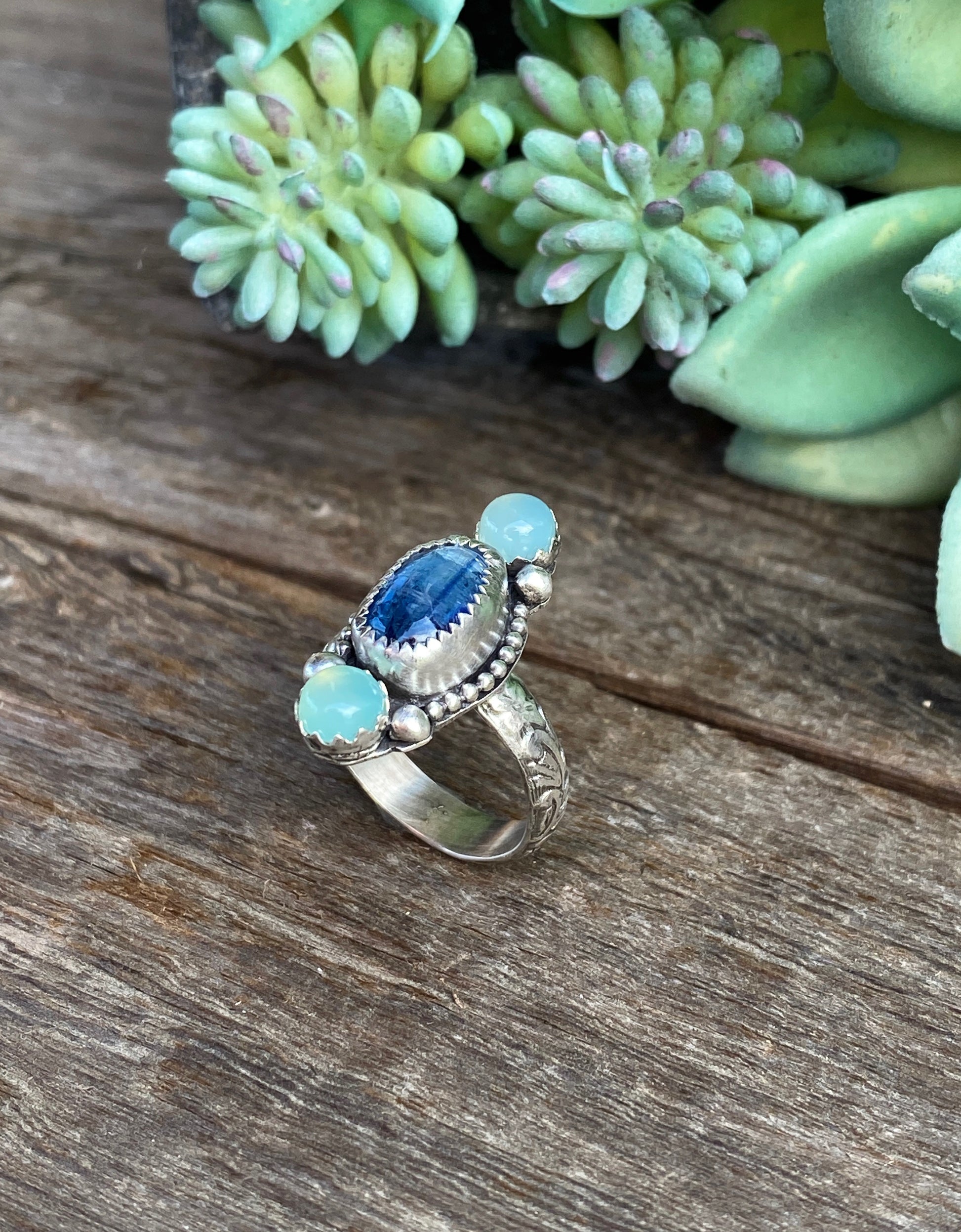 Triple Gemstone Ring - Blue Kyanite and Sea Green Chelcedony Ring