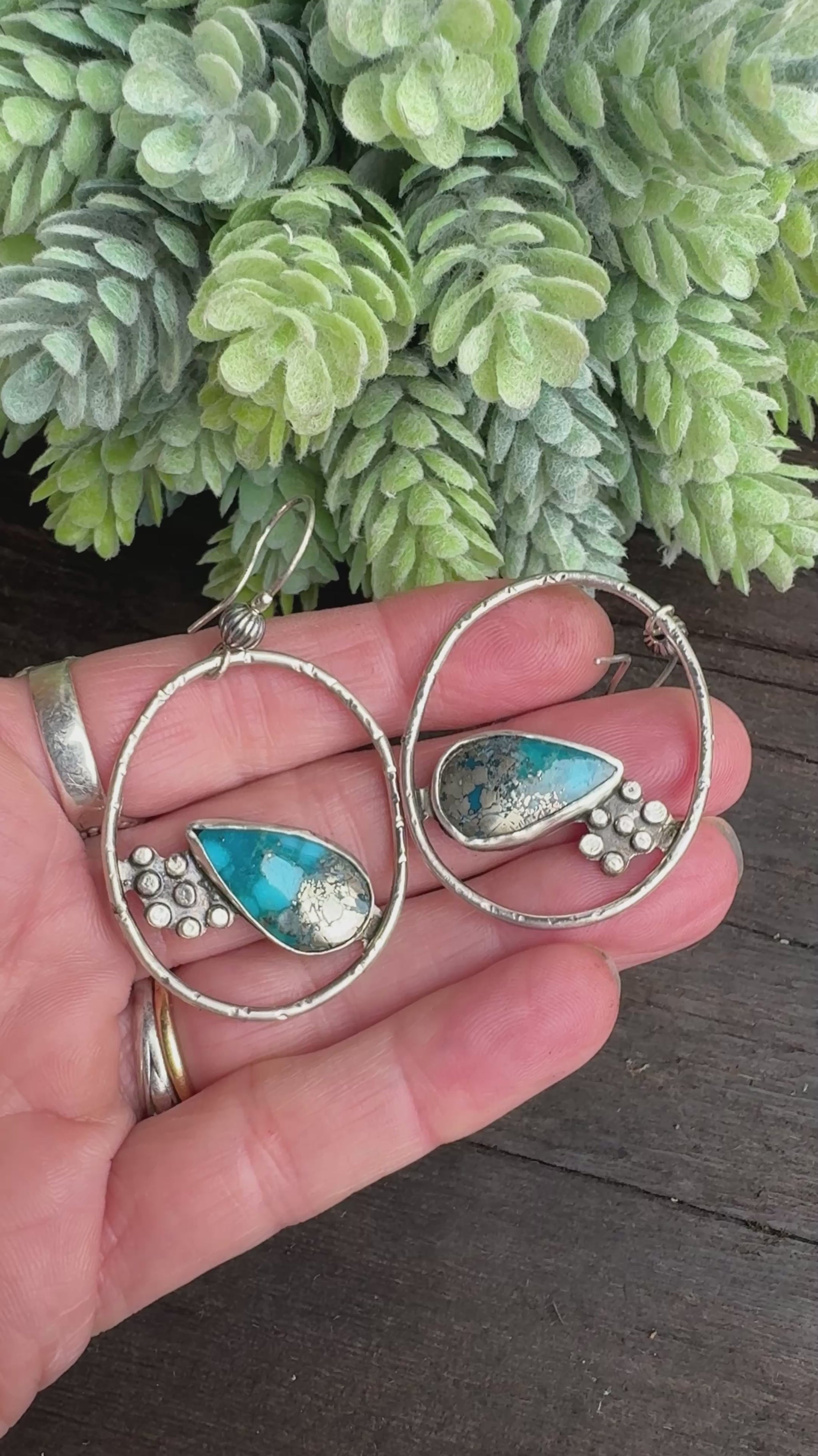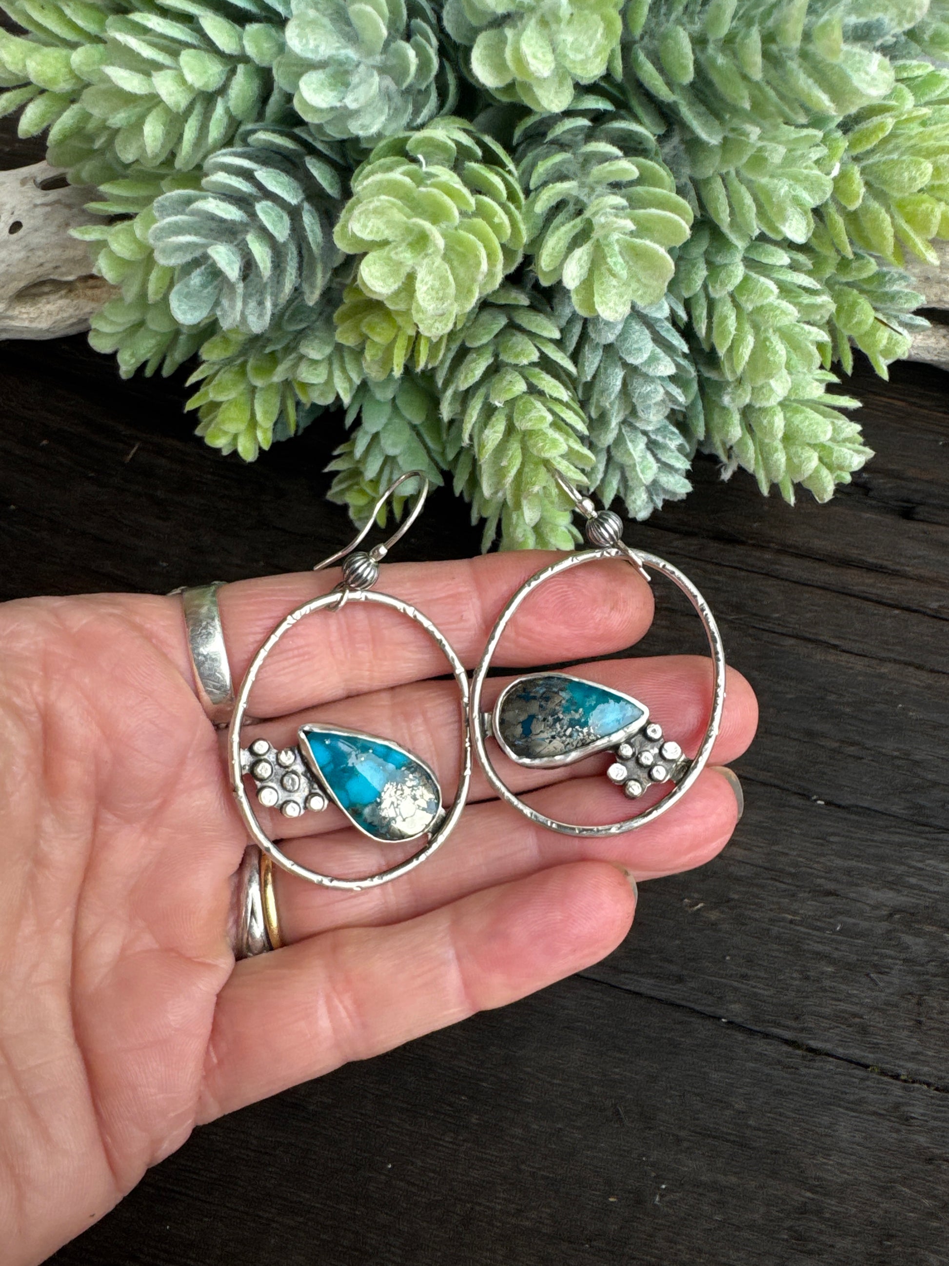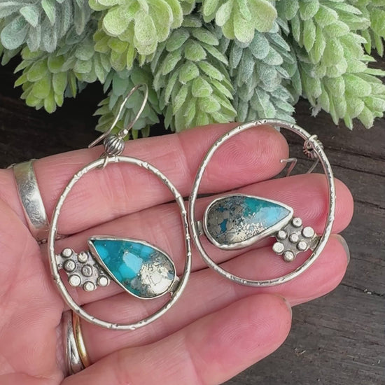 Elegant turquoise hoop earrings featuring vibrant blue stones with natural matrix patterns, each uniquely beautiful. Set within handcrafted sterling silver hoops with hammered texture and adorned with delicate silver pebble clusters for added detail. These lightweight statement earrings bring a perfect balance of bohemian charm and sophisticated style. A versatile piece that transitions effortlessly from casual to dressed-up occasions.