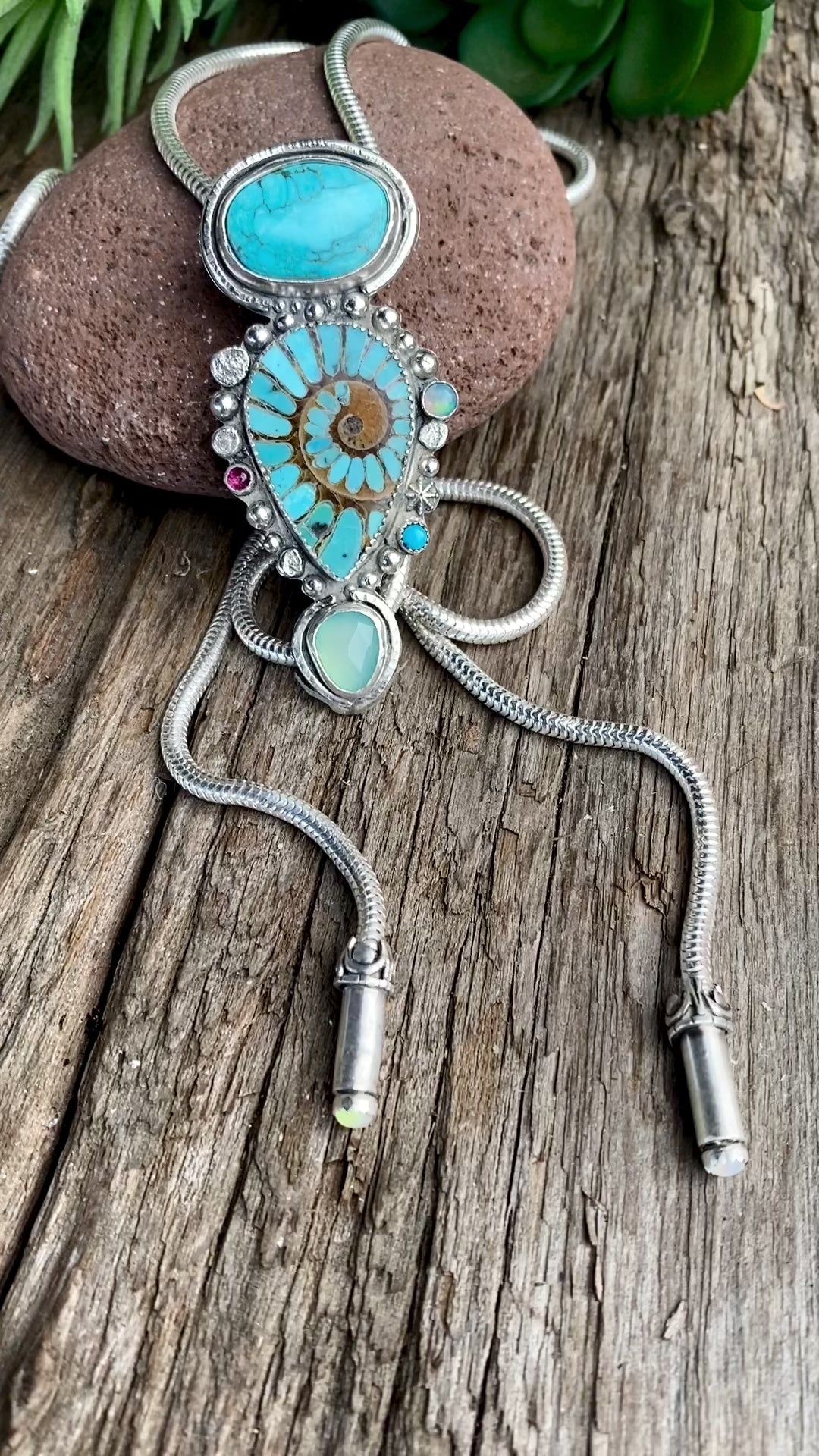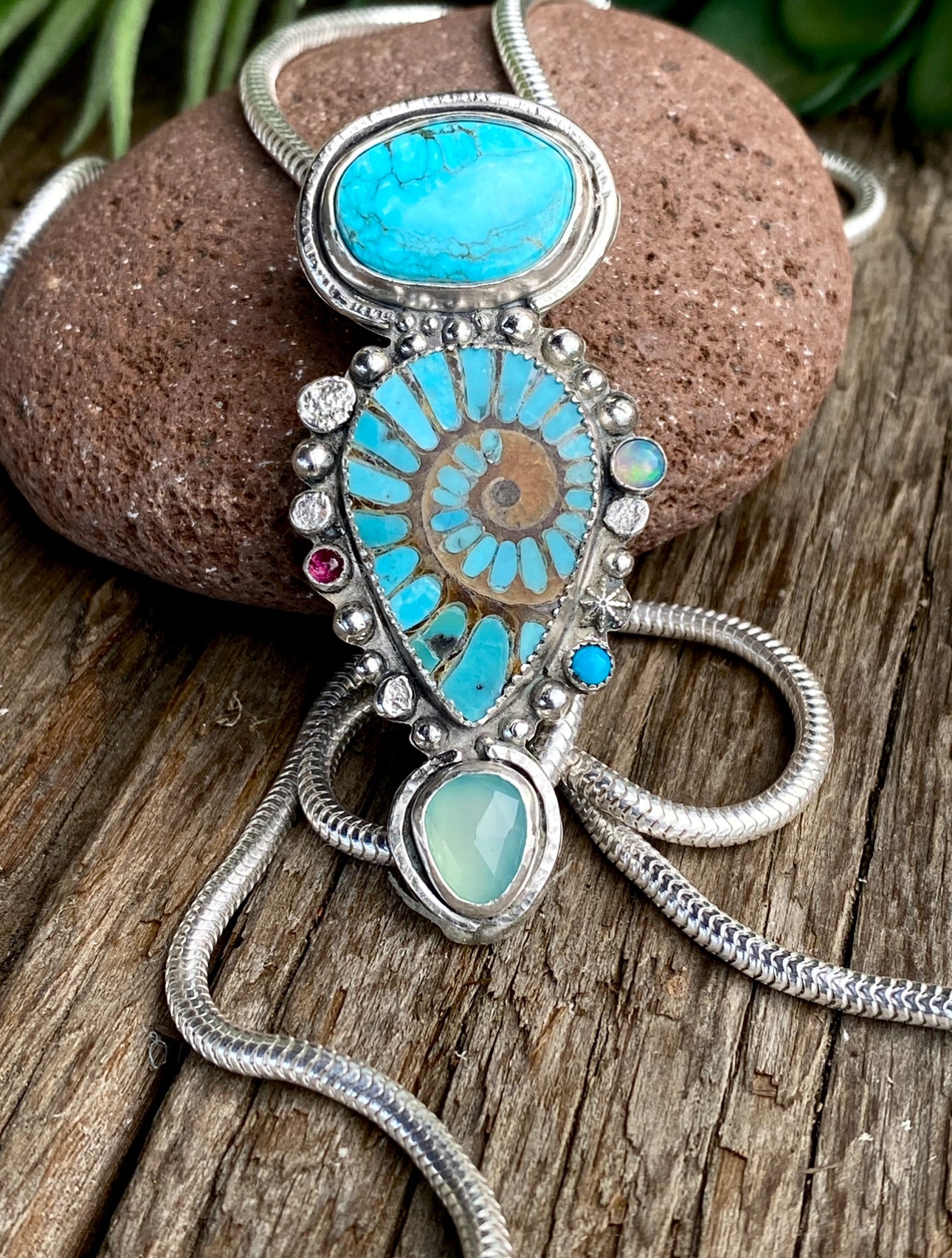 *Gemstones: Fossilized Ammonite With Inlayed Kingman Turquoise, Large And Small Kingman Turquoise, Blue Chalcedony, Opal And Ruby.