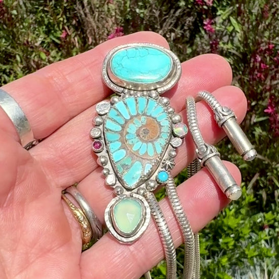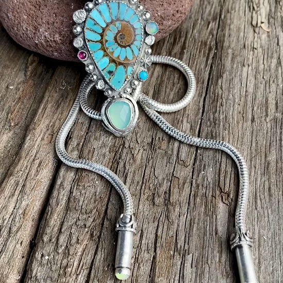 Turquoise Inlay Ammonite With Kingman Turquoise, Green Chalcedony, Opal And Ruby Bolo Style Necklace - Bolo Tie