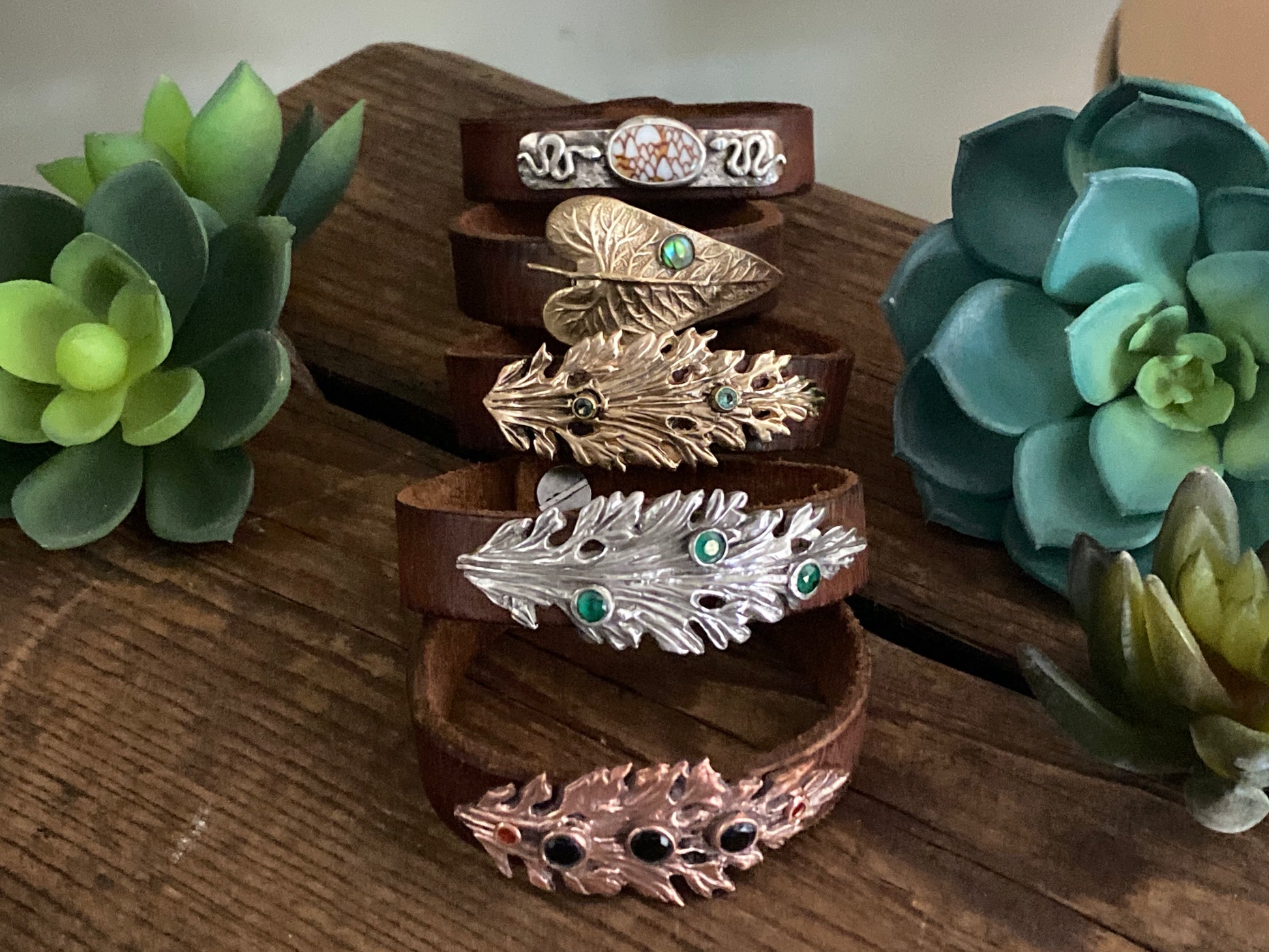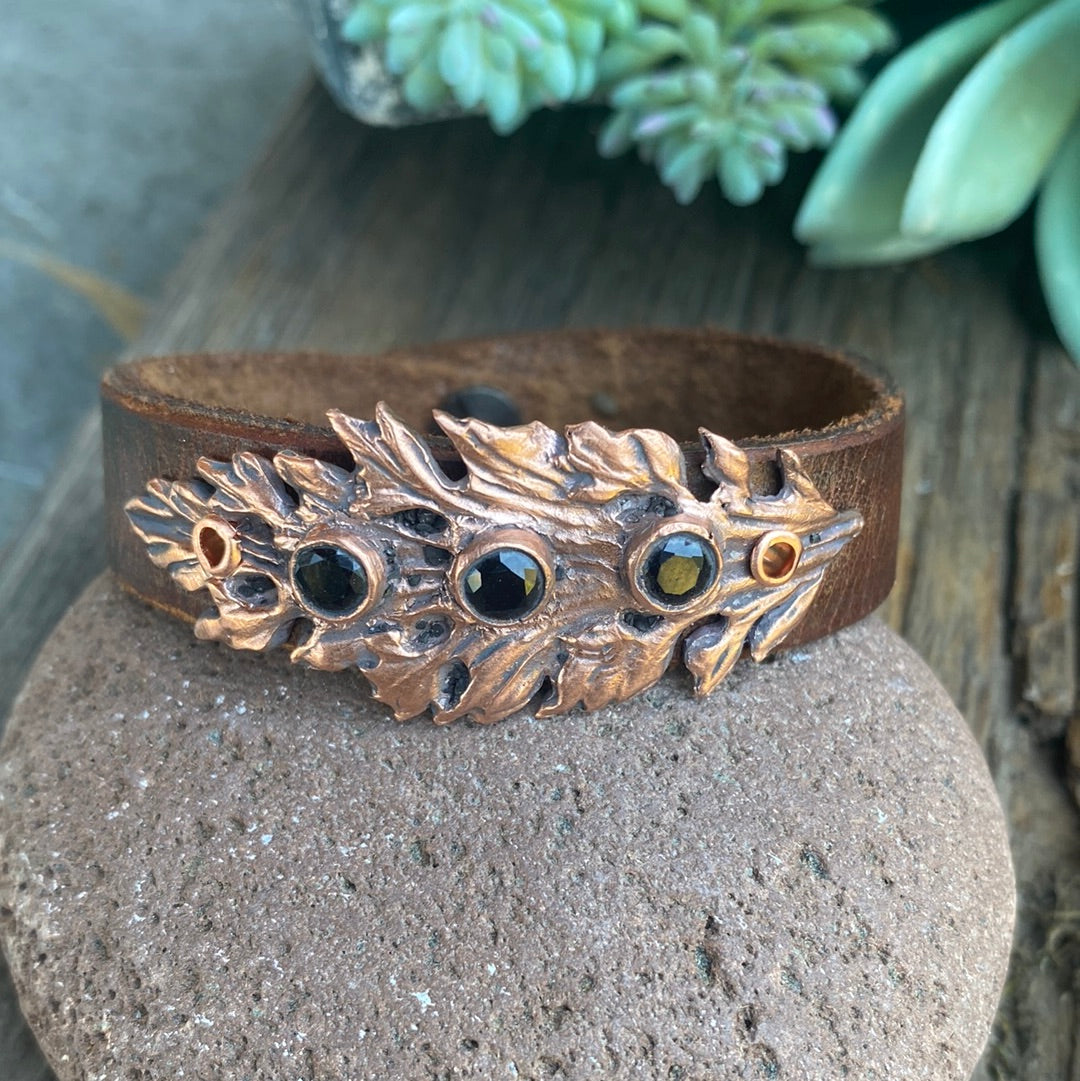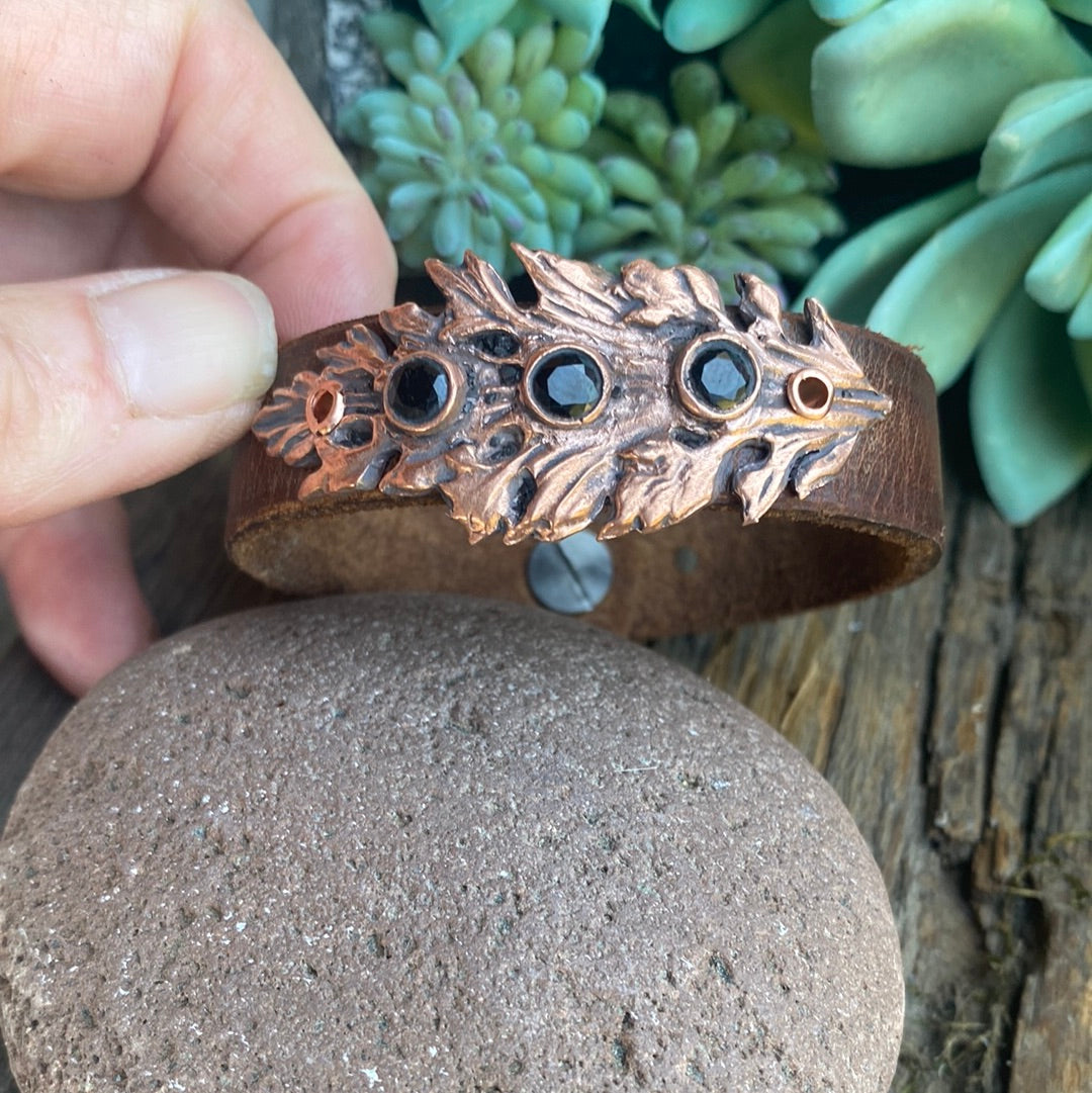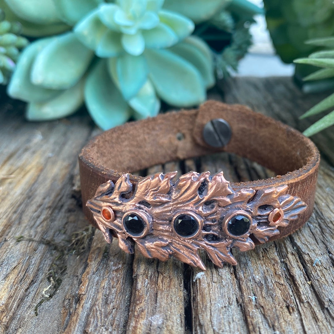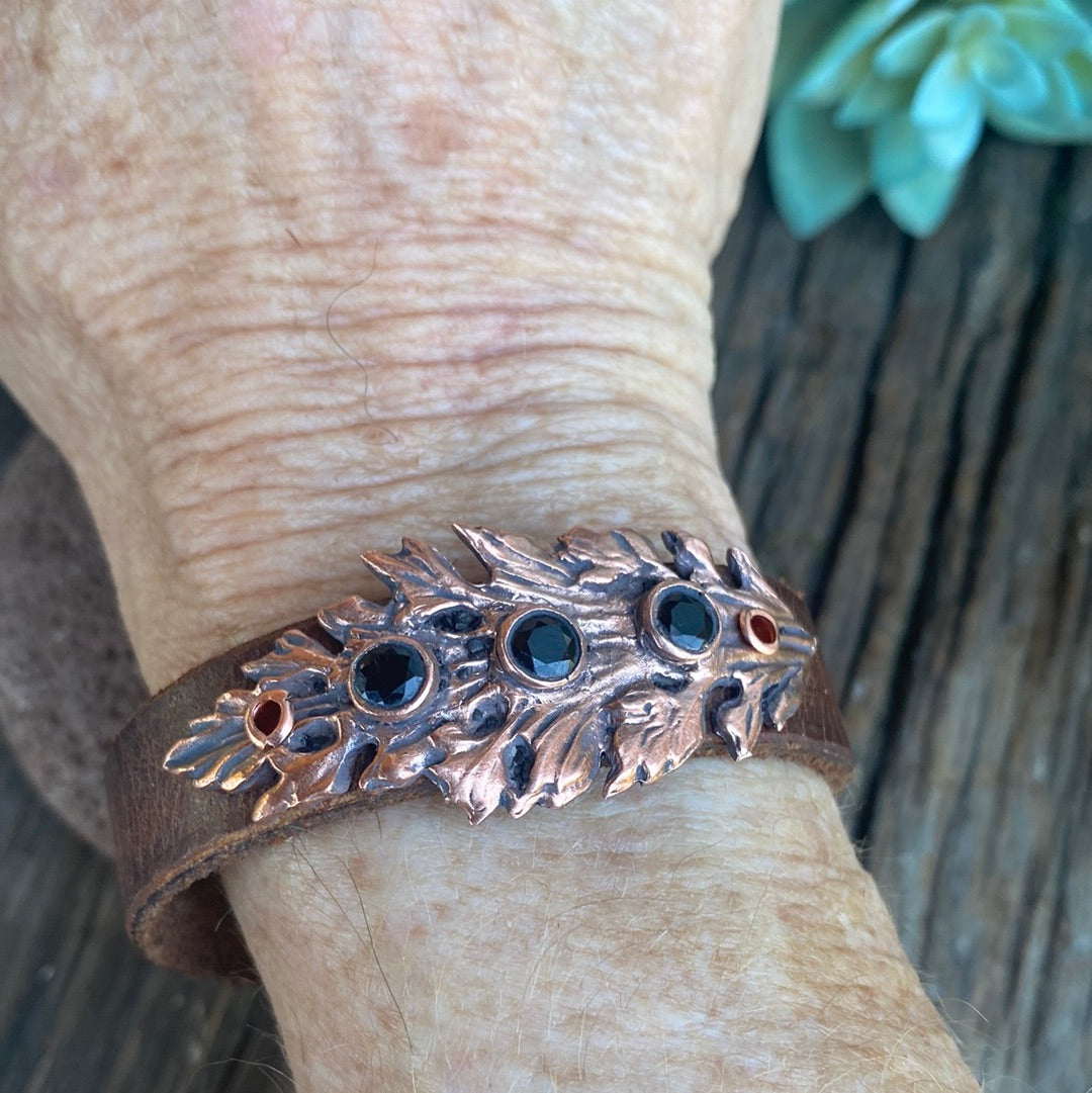 Made from vintage leather horse reins and cast copper leaf design with three embedded onyx gemstones. Chicago screw button closure, slightly adjustable from wrist size 7-7.5